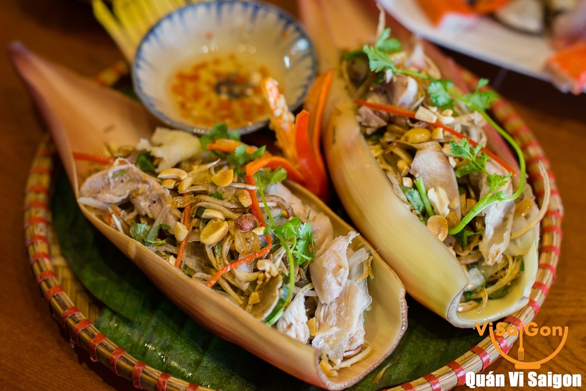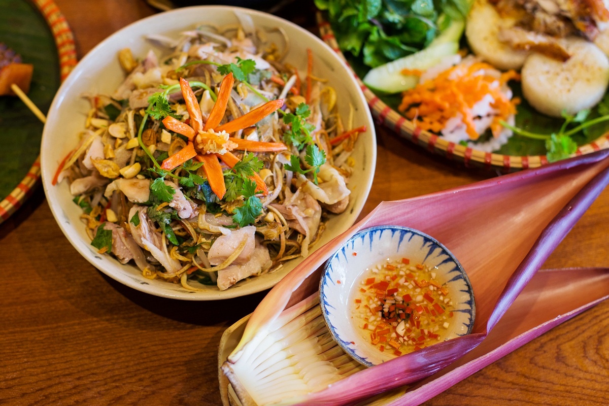 | Hoa chuối giòn giòn được trộn cùng thịt gà xé phay và lạc bùi bùi là món khai vị lý tưởng cho bữa tiệc. |