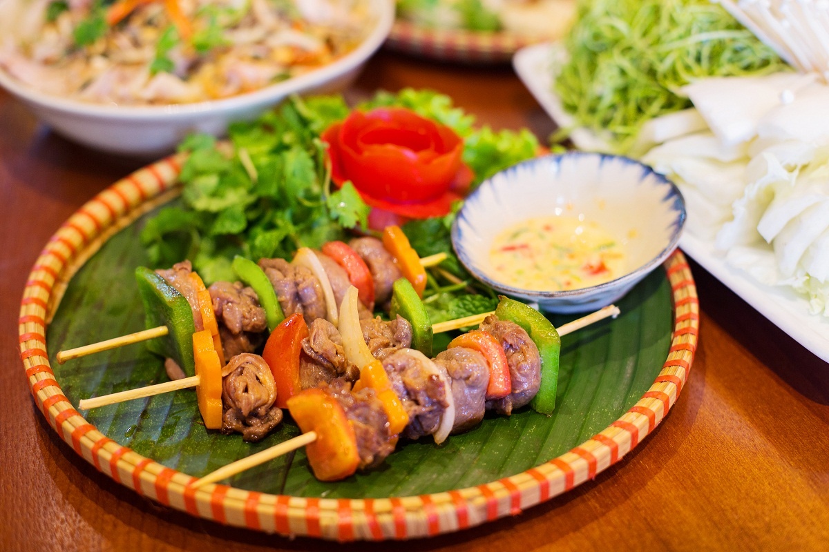 | Bò xiên nướng rau củ như một nét chấm phá cho bữa tiệc thêm sắc màu và đầy hương vị. Bò nướng thơm lừng, cháy cạnh kết hợp ăn ý với ớt xanh Đà Lạt, cà rốt, hành tây… cùng nước chấm chanh ớt chua cay. |