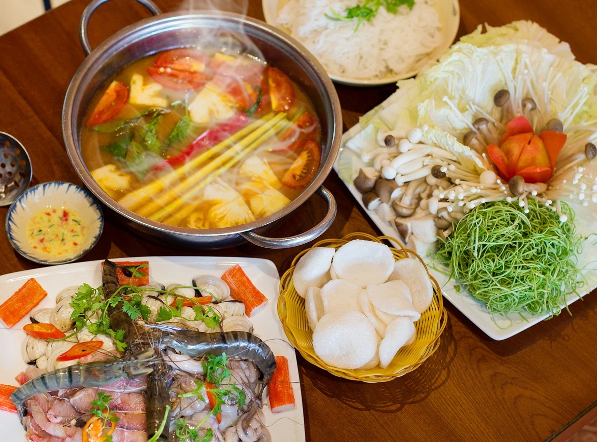 | Sau khi đã thưởng thức xong những món ăn khai vị, một nồi lẩu hải sản chua cay kiểu Thái nghi ngút khói sẽ giúp bạn thỏa mãn khẩu vị và đem lại sự ấm cúng trong ngày đông lạnh giá. |