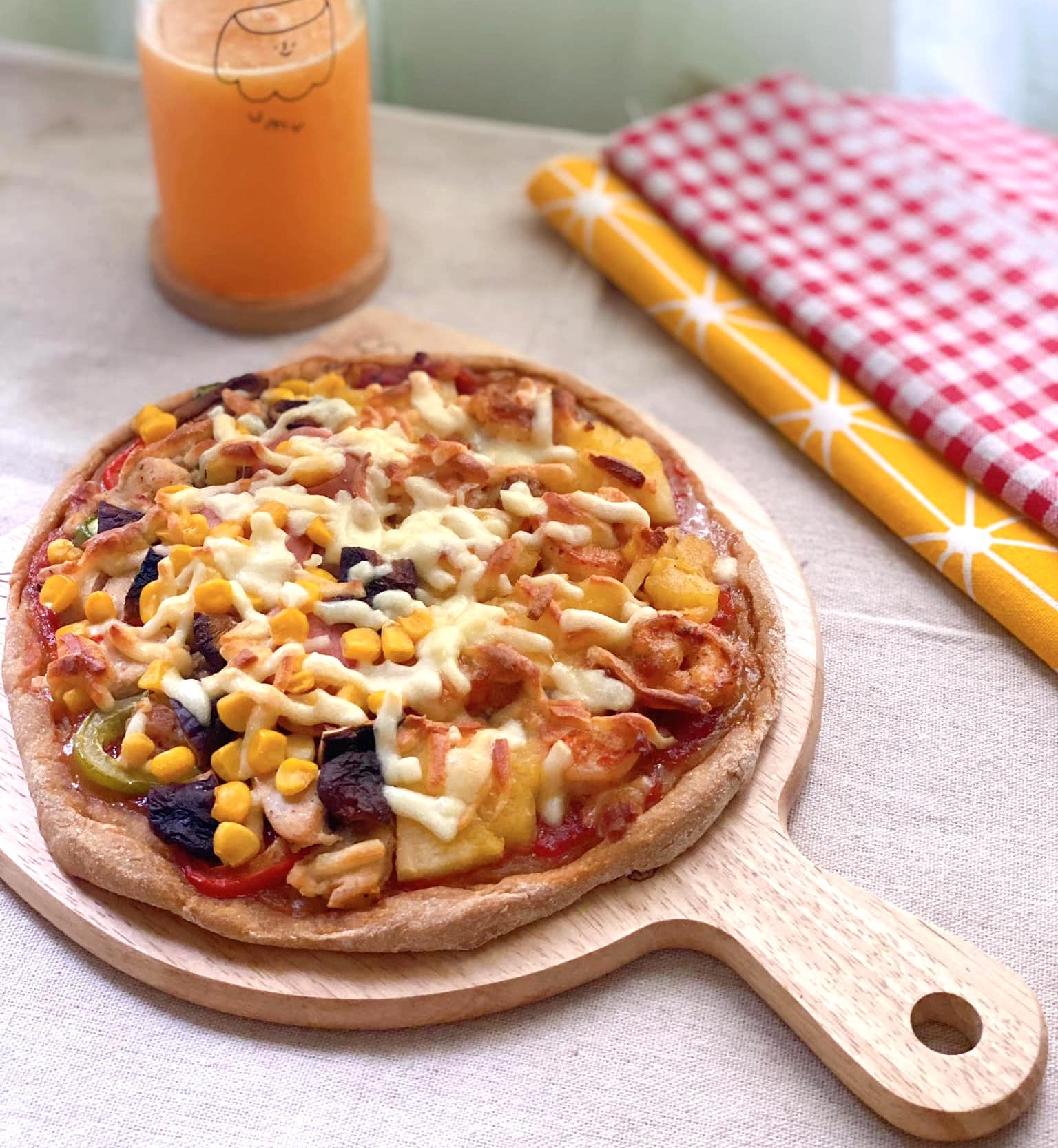 Đế bánh làm từ bột nguyên cám quyện lớp sốt cà chua. Thành phần ăn kèm gồm gà, ngô ngọt, nấm, tôm, dứa.