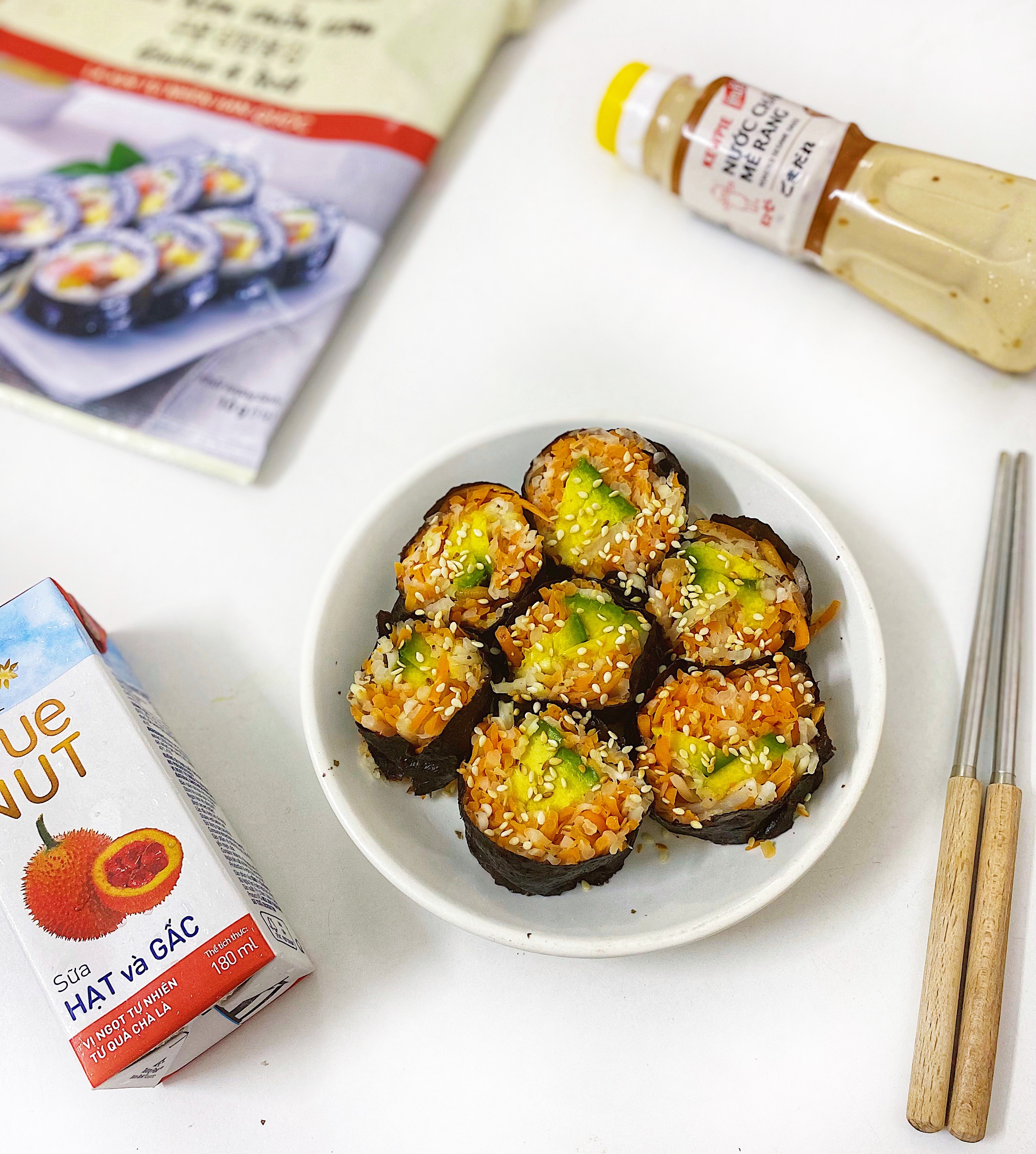 Bước 3: Trải lá kim chi, dàn đều cơm, thêm các nguyên liệu có sẵn và cuộn lại. Món ăn ngon hơn khi ăn kèm sốt mè rang.