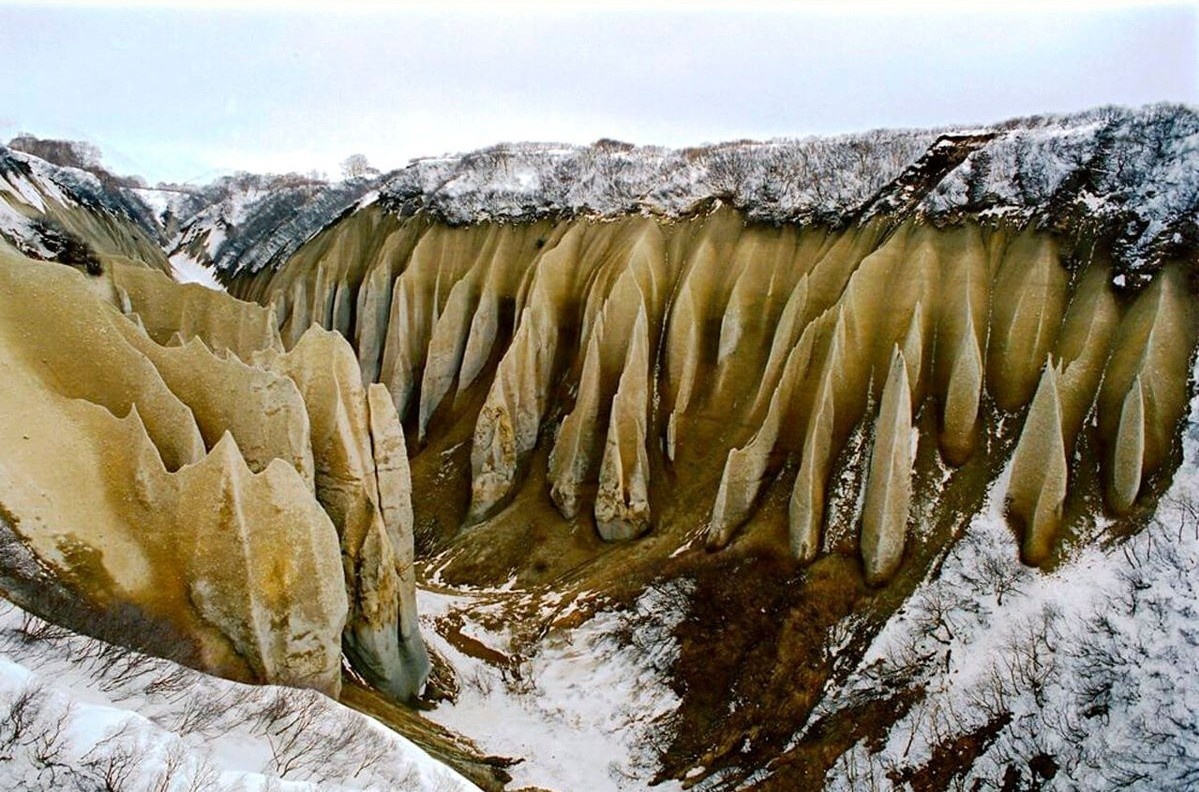 | Nơi này nổi bật với những cột đá bọt trắng dựng đứng cao ngang tòa nhà 16 tầng. Đây là loại đá núi lửa, bị đẩy từ khi núi lửa cháy dữ dội, siêu nóng. Trọng lượng đá bọt trắng rất nhẹ, thậm chí có thể nổi trên nước. Ảnh: RussiaTrek. |