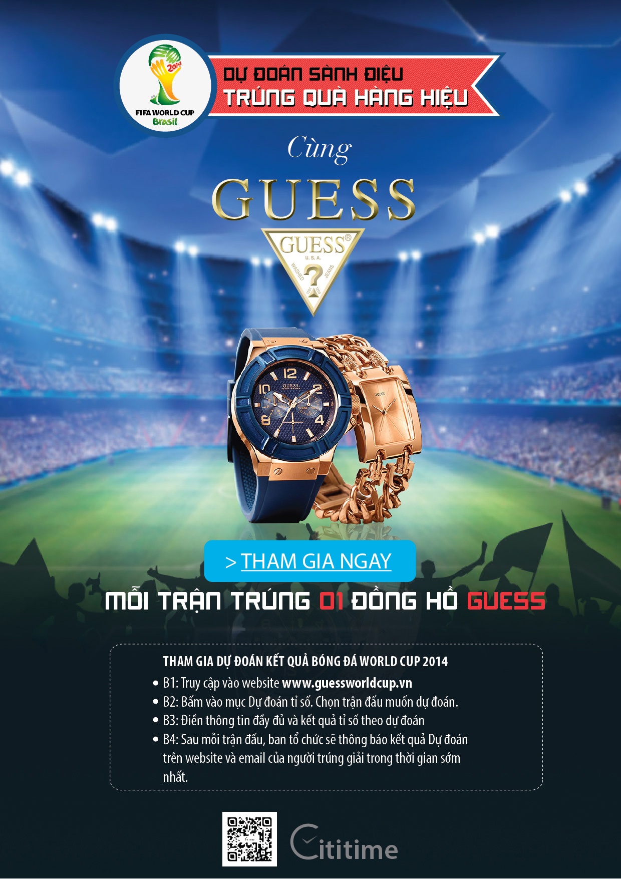 Không chỉ vậy, hòa mình vào không khí sôi động của World Cup, trong thời gian từ ngày 18/6 - 14/7, đồng hồ Guess thực hiện chương trình Guess World Cup để tăng tính trải nghiệm, sự thú vị cho các fan bóng đá. Theo đó, khách hàng có thể dự đoán tỷ số các trận đấu với phần thưởng mỗi trận đấu là 1 chiếc đồng Guess, và một voucher giảm 30% cho tất cả những ai tham gia dự đoán.