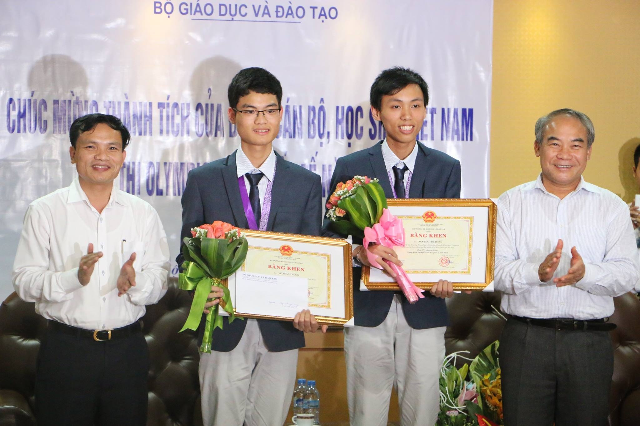| Thứ trưởng GD&ĐT Nguyễn Vinh Hiển (bên phải), Cục trưởng Cục khảo thí và Kiểm định Chất lượng Giáo dục Mai Văn Trinh trao bằng khen cho những học sinh đoạt huy chương vàng. Ảnh: Quyên Quyên. |