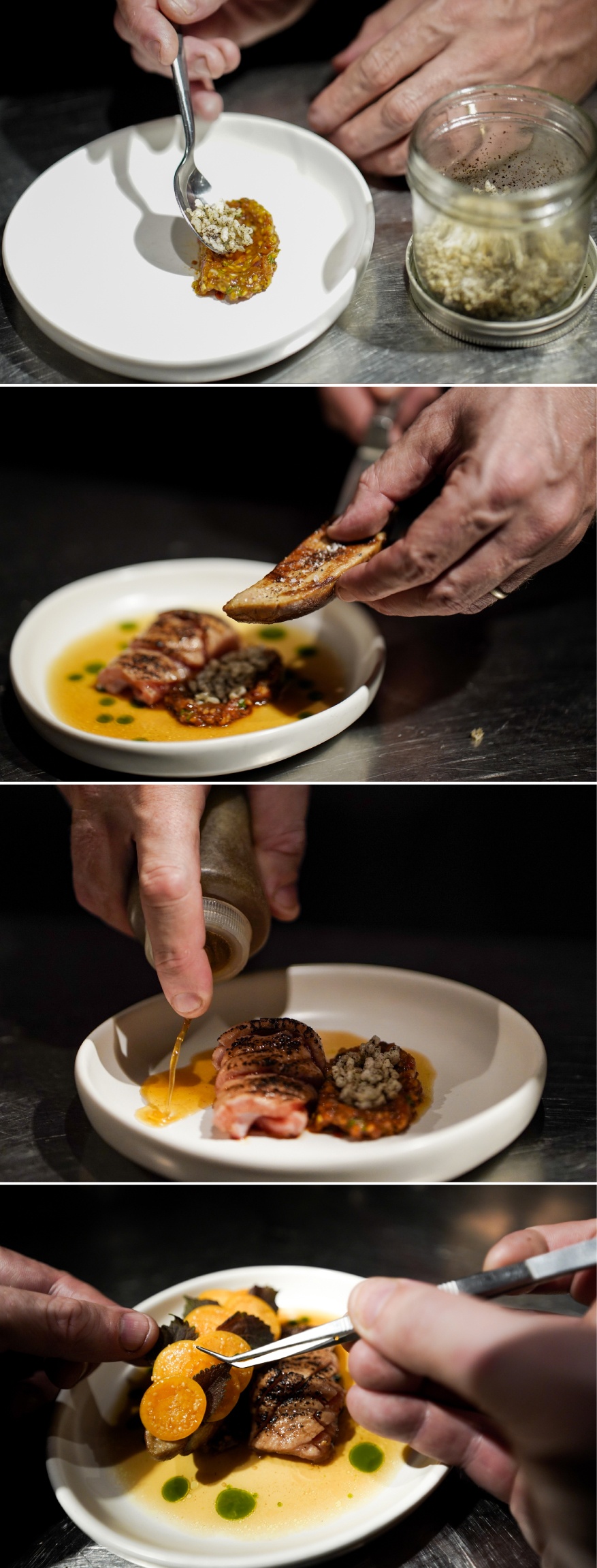 Ngôi sao của món ăn là chutoro cá ngừ vây xanh Nhật Bản và gan ngỗng Lanaurdie từ Pháp. Phần sốt kèm theo gồm giấm gạo Nhật, dầu tía tô, sốt cà chua và quả tầm bóp.