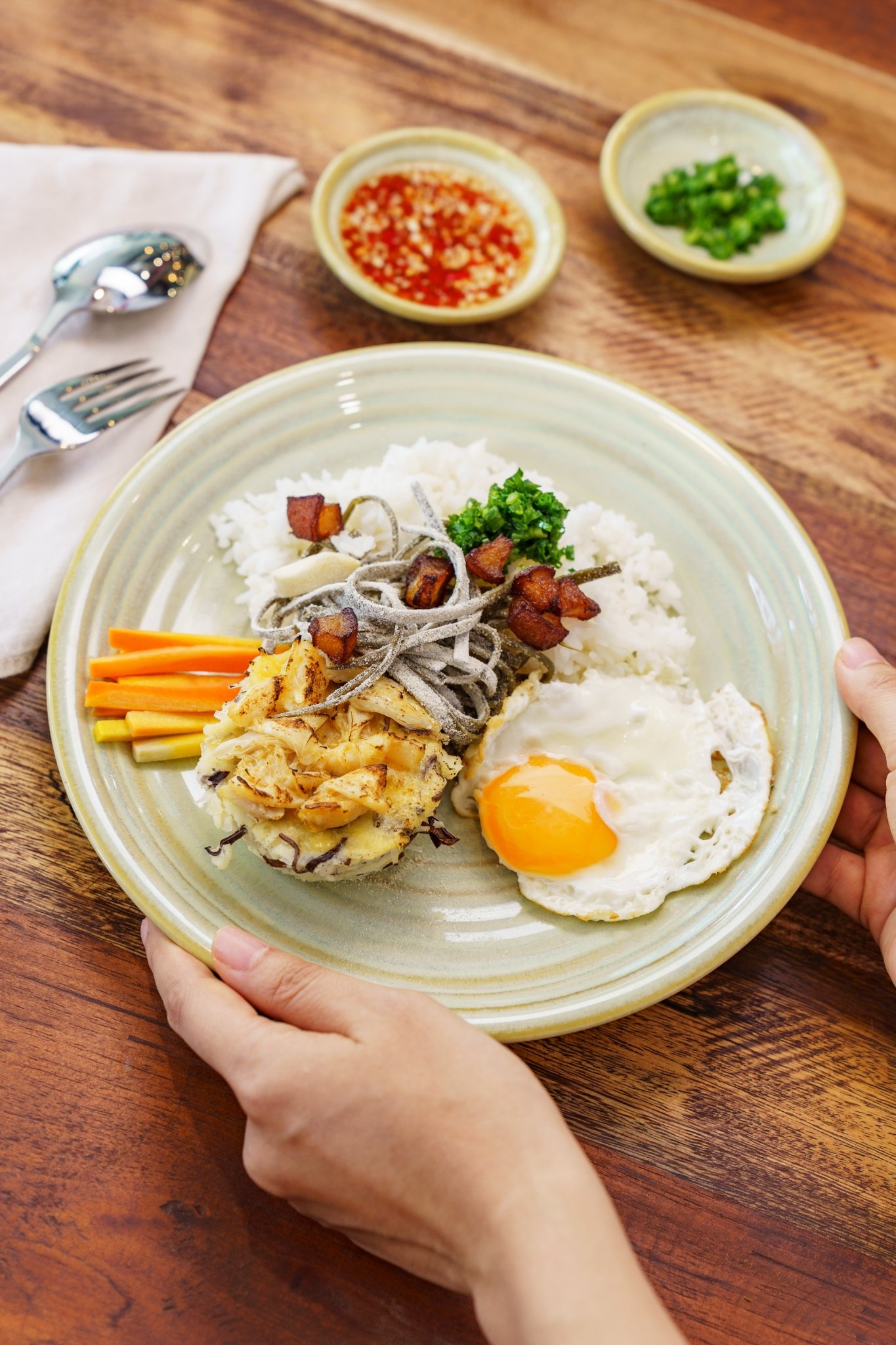 - Hầu hết món được trình bày bắt mắt, chỉn chu. Prawn pasta nổi bật với sự kết hợp giữa mì tươi thủ công và tôm nuôi tự nhiên ở vùng rừng đước Cà Mau. Món cơm tấm lạ miệng nhờ cách biến tấu cùng chả cua, trứng, nấm mèo và tàu hũ.