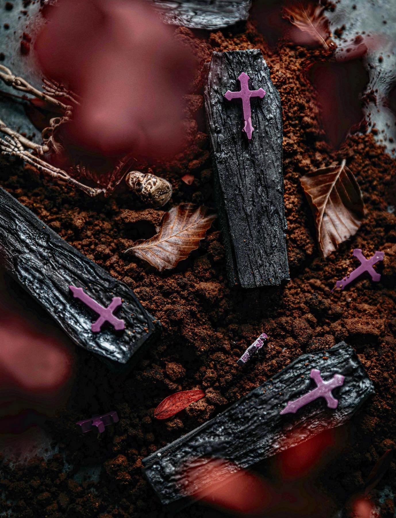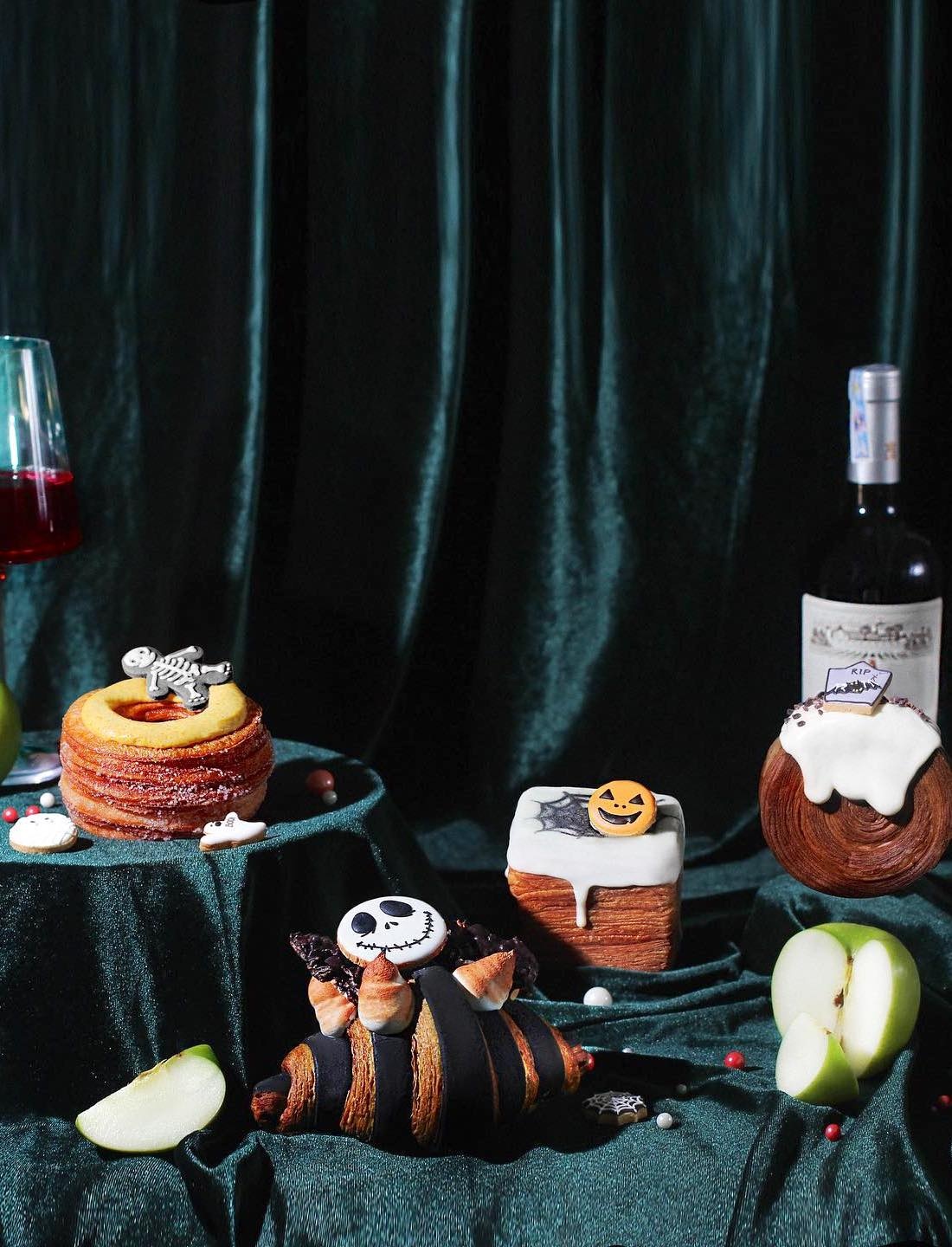 - Bánh CAFFIN được thiết kế dưới dạng Opera, vẻ ngoài mang dáng dấp chiếc quan tài, bên trong ẩn chứa nhiều tầng bánh với vị chủ đạo từ phô mai nướng cháy cùng cà phê Arabica. Bánh FUNGI tái hiện hình ảnh nấm tím mùa Halloween với thành phần việt quất rừng, chanh tây và cốt bánh mật ong Medovik kiểu Nga. MALEFICENT là món bánh tart đen từ than tre, có kem trà earl grey supérieur, dứa mật và dâu đen hòa quyện. ONIBI, thức bánh nổi bật với hình nến, đan xen hương vị lá nếp, nhân dừa nước thơm ngọt và béo. Nhìn chung, mức giá cao song cách trang trí từng chi tiết bánh và hương vị khá đặc sắc.