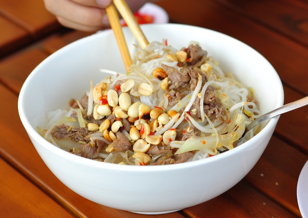 Quán còn có bún bò Nam bộ. Có lẽ dân Hà Thành đã rất quen với bát bún có đủ thịt bò xào tỏi, giá chần, rau sống, hành phi, lạc trộn đều cùng nước mắm ngọt để thưởng thức. Bún bò ở đây về cơ bản cũng vậy nhưng thịt bò lại xào với sả, ớt, hành tây. Anh chủ quán người miền trong cho biết như vậy mới chuẩn bún bò Nam bộ.