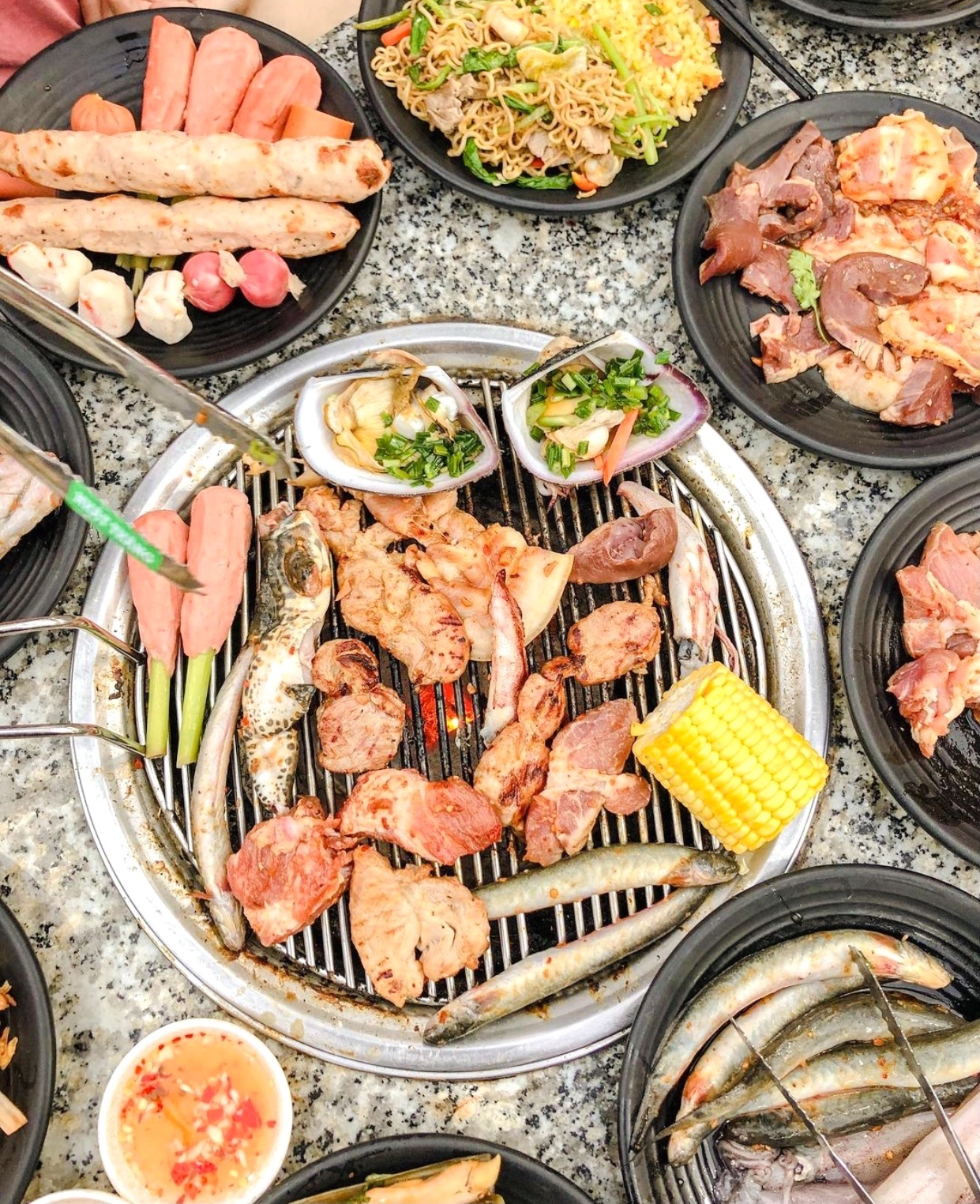 Các món thịt được tẩm ướp đậm đà. Nước chấm ăn kèm gồm muối ớt xanh, muối tiêu chanh, tương ớt, tương cà... Quầy tự phục vụ còn có cơm chiên, mì xào hay trái cây giúp tín đồ ẩm thực thỏa mãn vị giác. Lẩu tôm càng cũng là gợi ý lý tưởng để bạn thưởng thức trong những ngày trời se lạnh. Trên diễn đàn ẩm thực, tài khoản Bé Huyền chia sẻ: "Lượng khách đến quán khá đông vào buổi chiều tối, không khí tương đối xô bồ và ngợp khói". Ảnh: Canquetsaigon. |