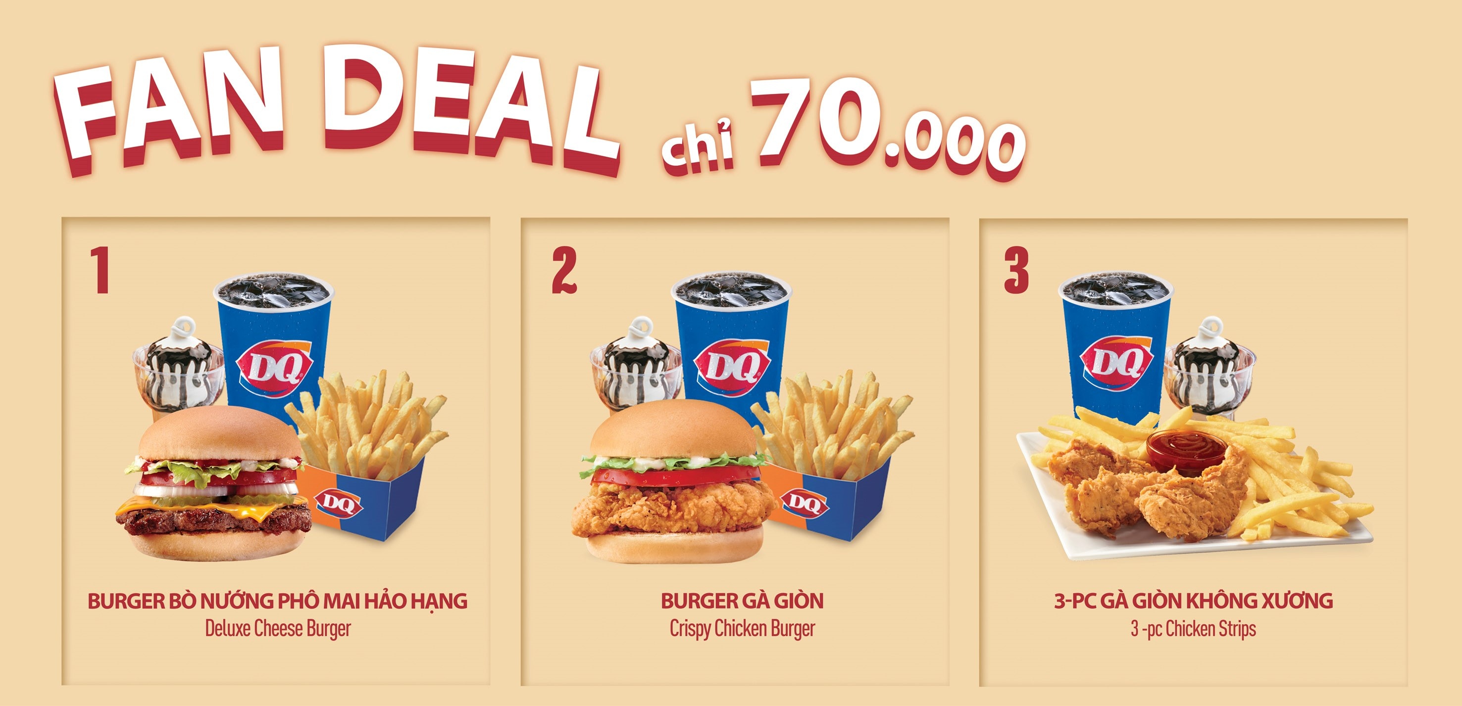 Mang nguyên mô hình DQ Grill & Chill từ Mỹ về, nhà hàng tại Việt Nam cũng có các bữa ăn ngon giá trị “Fan Deal” như các nhà hàng DQ Grill & Chill khắp thế giới. Bữa ăn gồm món chính như burger, gà rán kèm khoai, nước và cả một ly kem ngon tráng miệng hiện được giới thiệu ở mức giá chỉ 70.000 đồng.