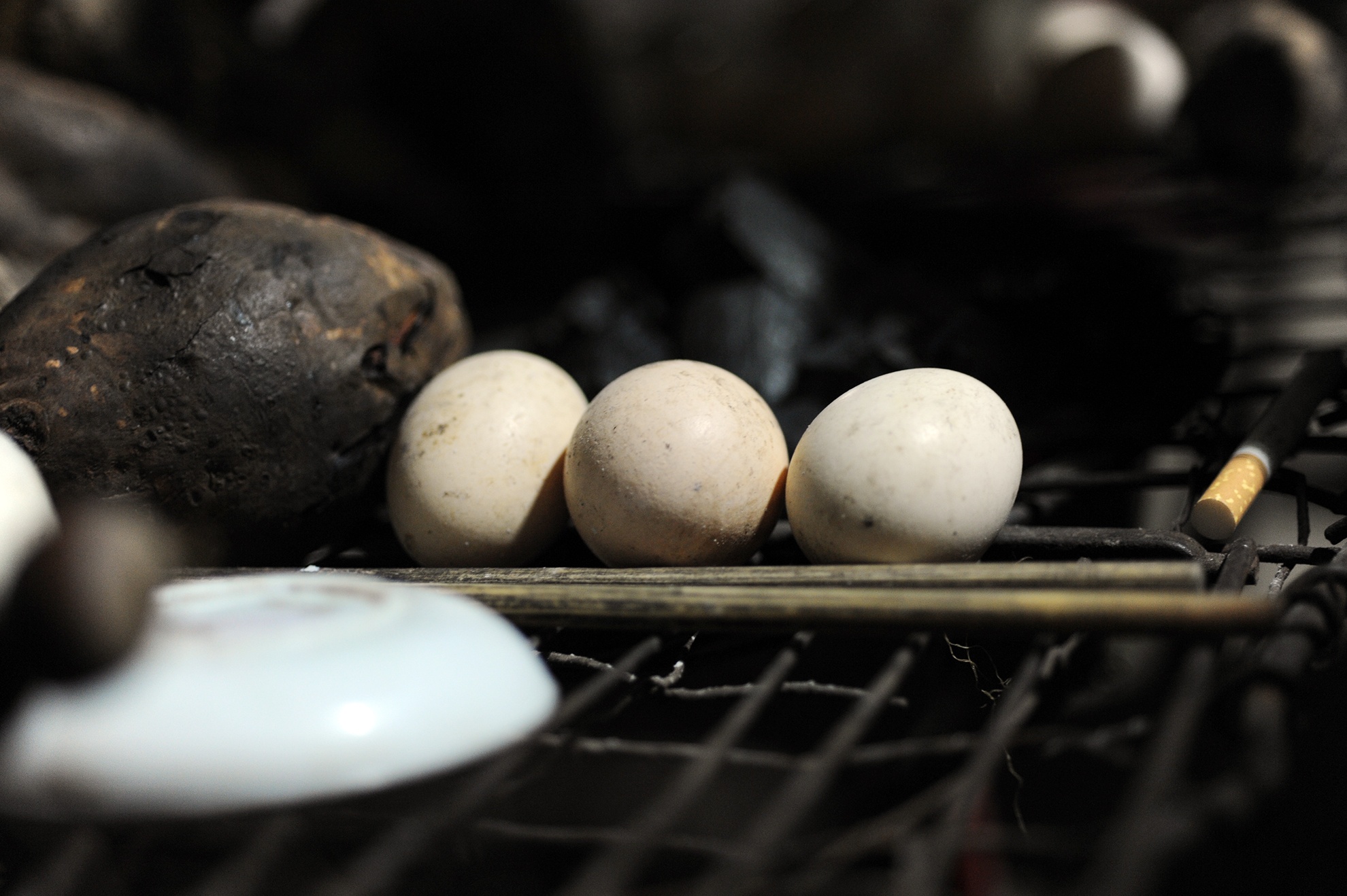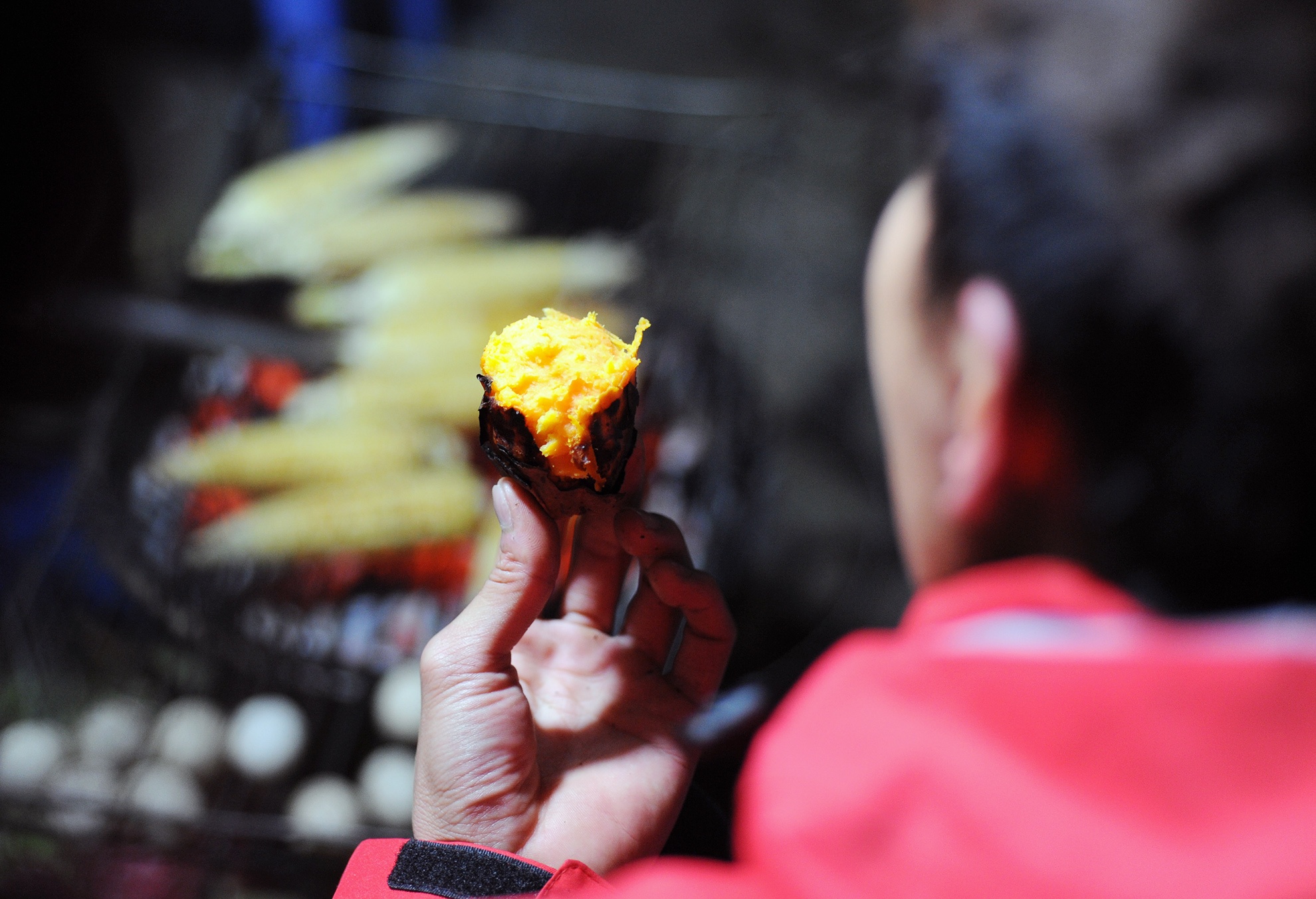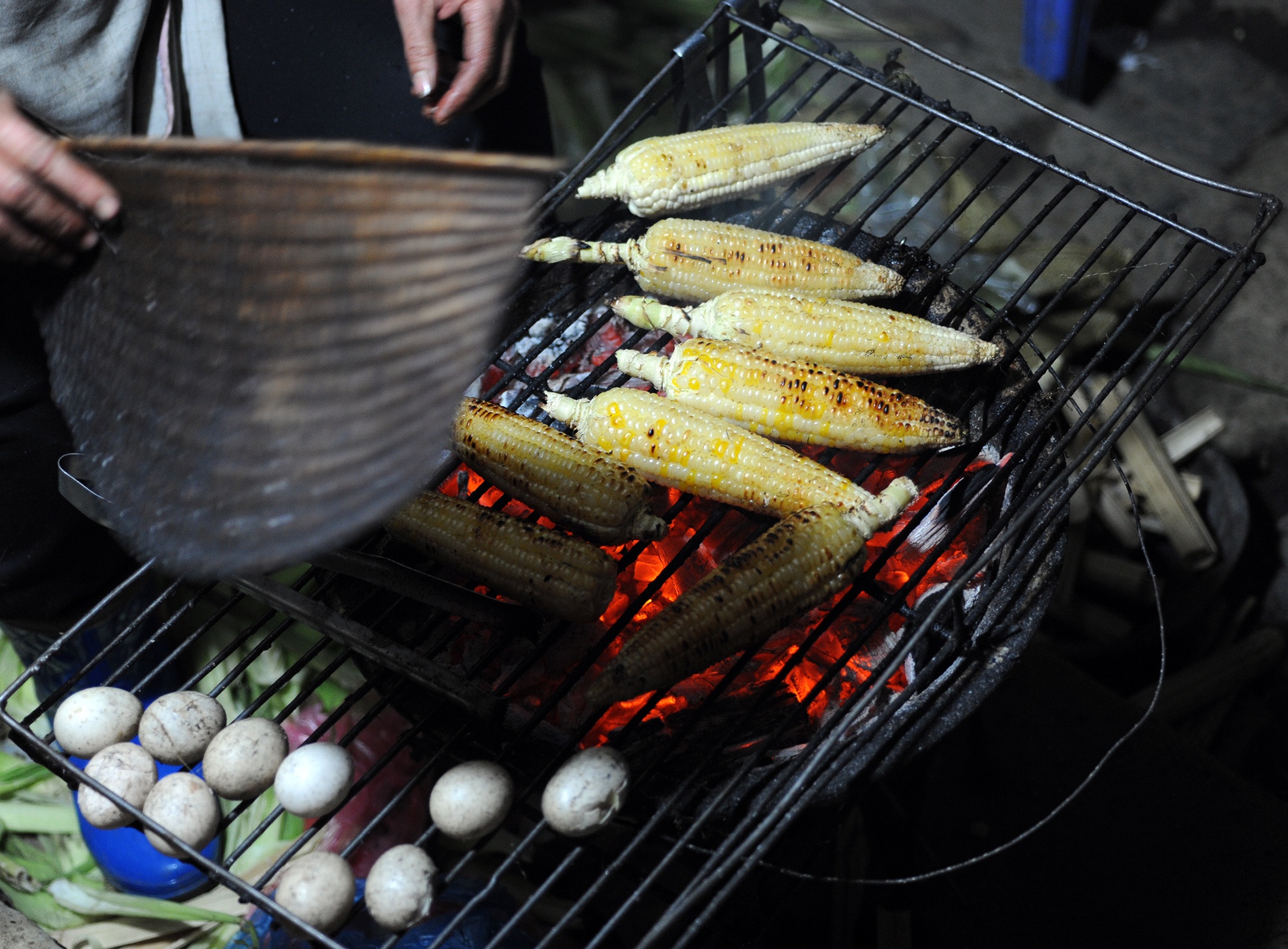 Đồ nướng gồm ngô, khoai nướng và trứng luộc.