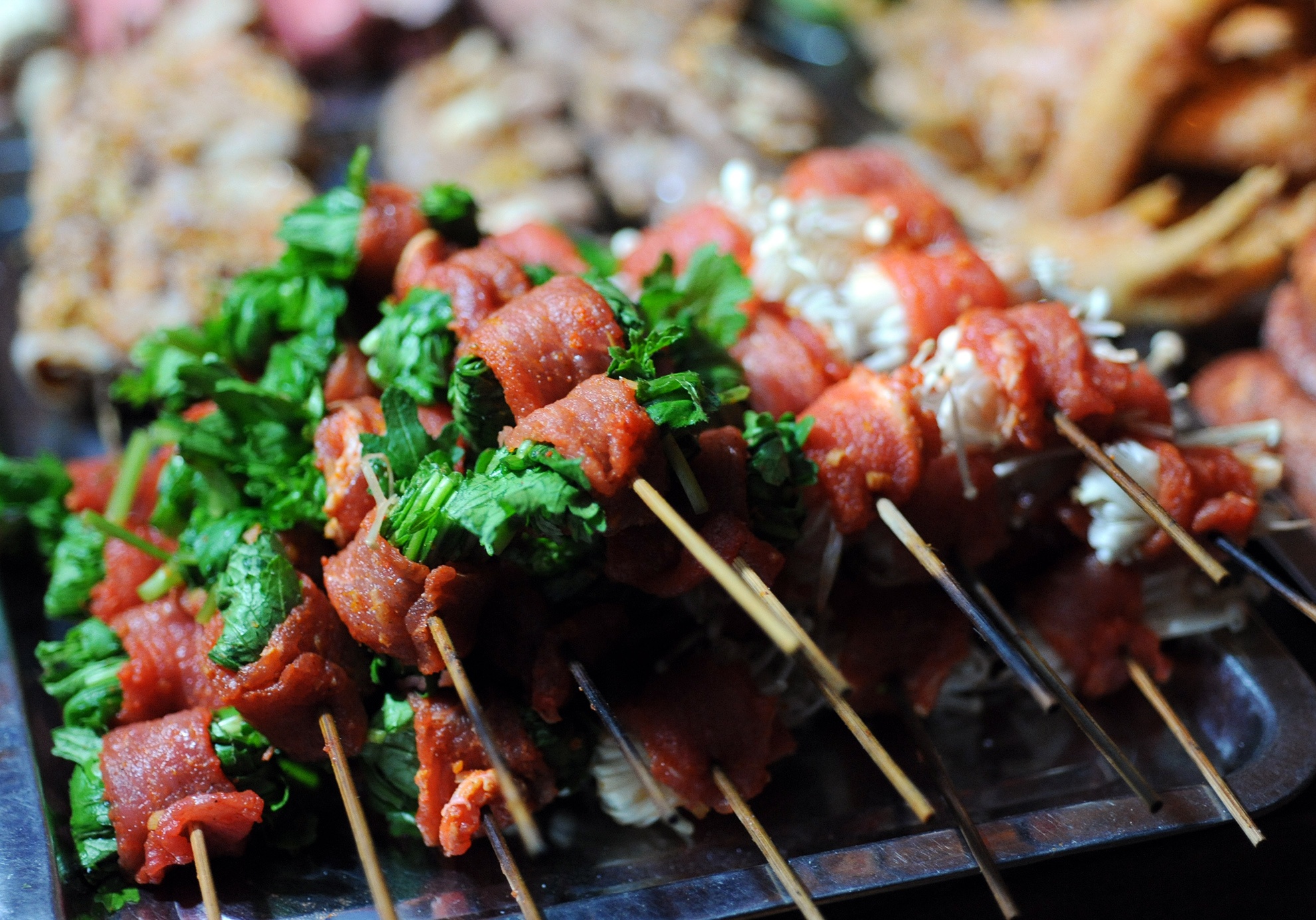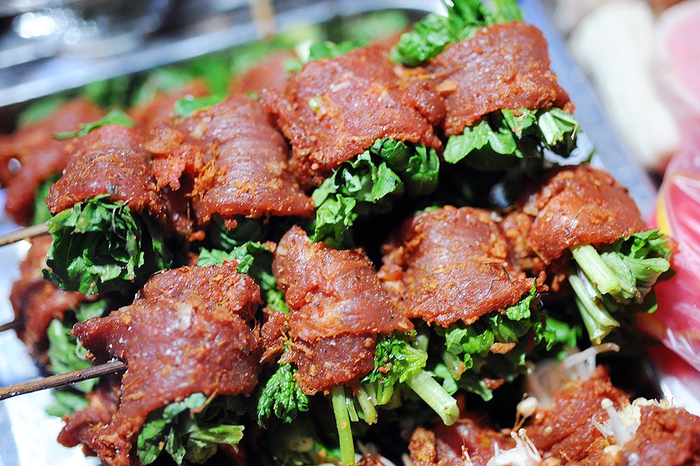 Thịt lợn bản kẹp rau cải mông bán khá chạy được bán với giá từ 15.000 đồng - 30.000 đồng/xiên tùy kích cỡ.