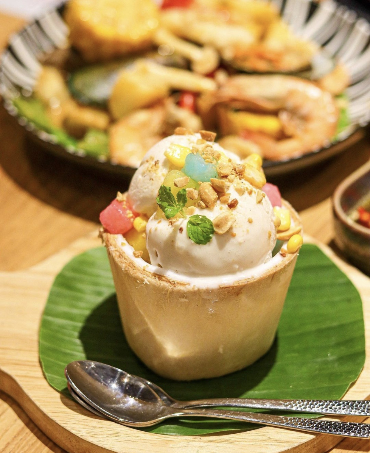 Ngoài ra, gỏi má heo trộn thính, hải sản xô thấm gia vị hứa hẹn làm bữa tiệc Giáng sinh của bạn thêm hấp dẫn. Thực khách còn có cơ hội tráng miệng với món kem dừa thơm ngon, đặc trưng của xứ sở chùa Vàng. Trên diễn đàn ẩm thực, tài khoản Kimthoa2912 cho biết: "Không gian quán yên tĩnh. Nhân viên nhiệt tình tư vấn các chương trình khuyến mãi và phục vụ món tương đối nhanh. Đồ ăn ở đây khá cay. Bạn nên dặn phục vụ điều chỉnh độ cay để hợp khẩu vị". Ảnh: Ansapsaigon. |