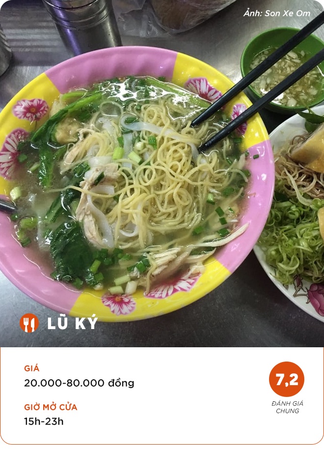 Món ăn: Hủ tiếu mì gà, miến gà, bánh canh, bún gạo, bánh lọt, huyết...