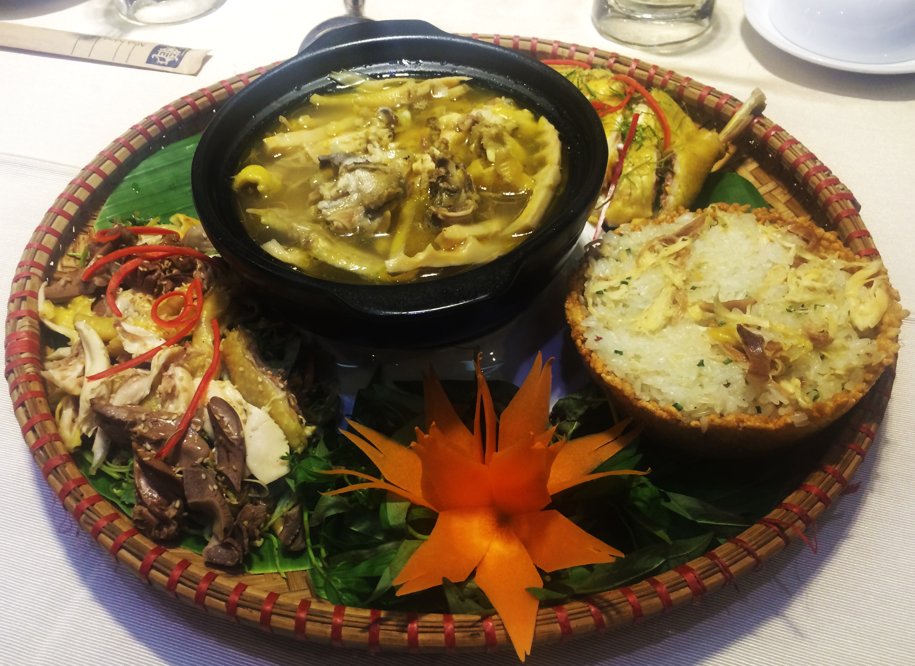 | Tại Kẻ Chợ, thực khách có nhiều lựa chọn hấp dẫn như cơm rang dưa bò, lẩu riêu cua bắp bò, heo tộc lên mẹt, cá chình nướng muối ớt… Trong ảnh là món gà đặc sắc của nhà hàng. |