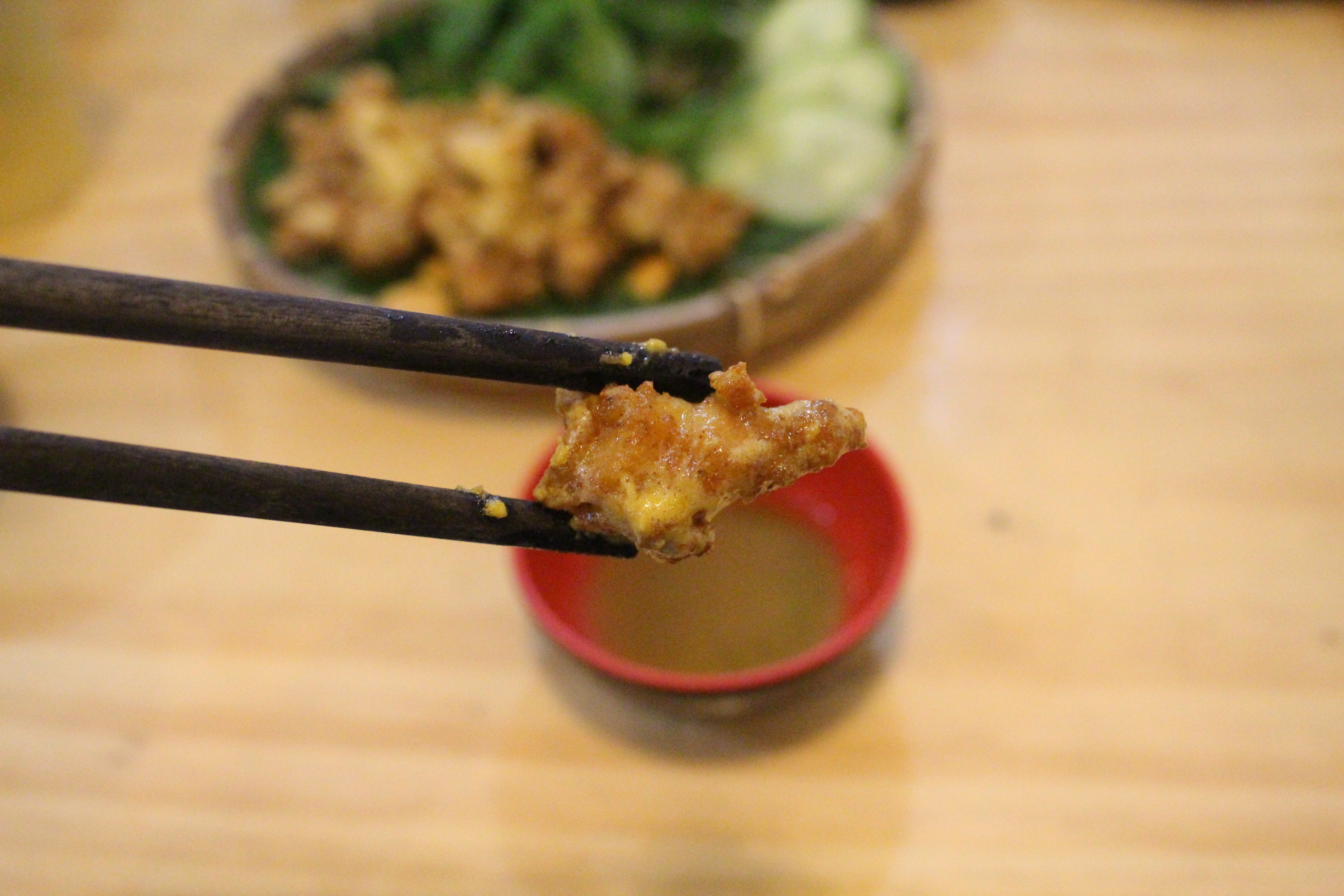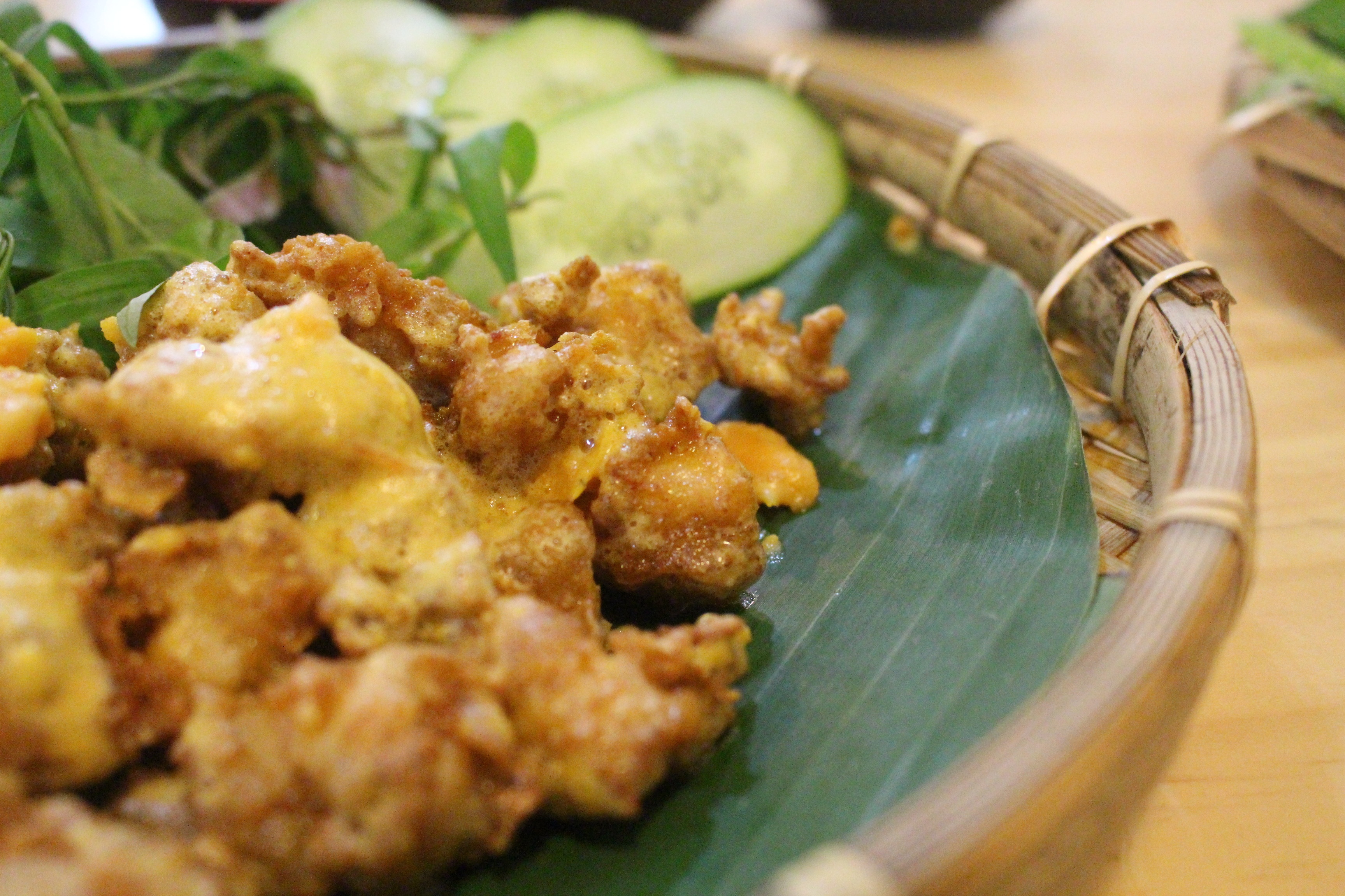 Bao tử ếch chiên nước mắm có độ giòn nhẹ của lớp bột mỏng, sần sật của bao tử "gà đồng", chua thanh của nước chấm xí muội, thanh mát của dưa leo. |