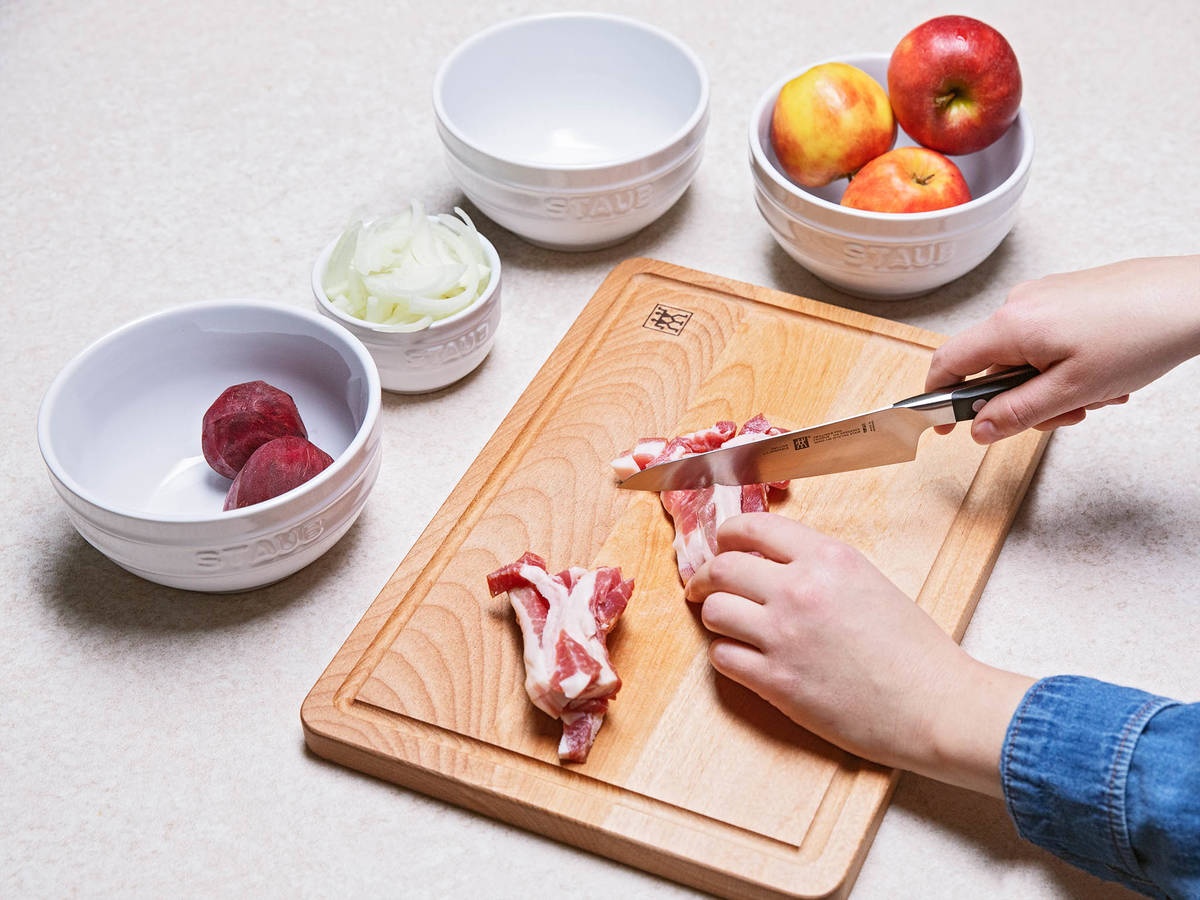 - Cắt thịt xông khói thành hình khối.