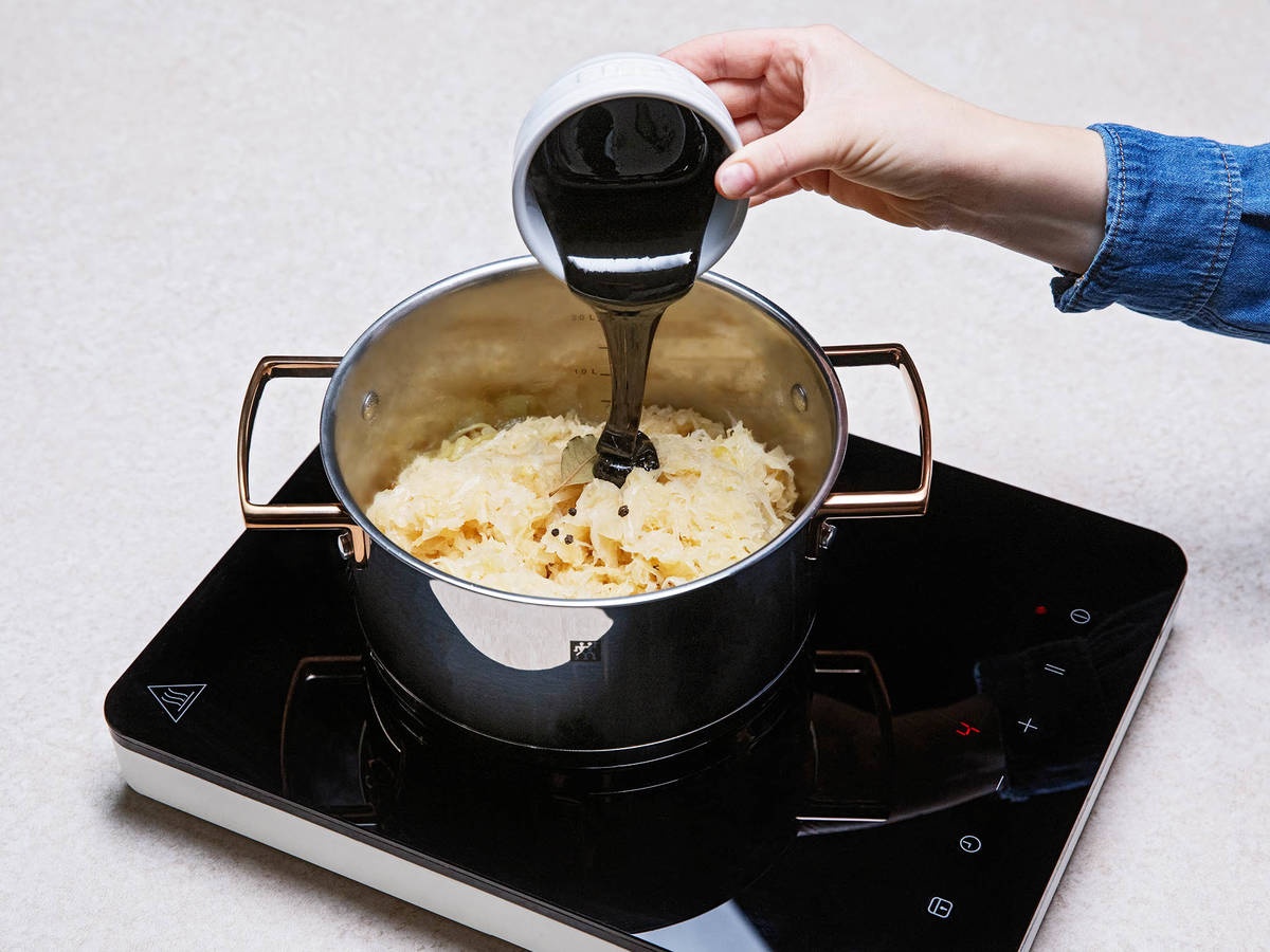 - Tiếp tục cho dưa cải Đức, lá nguyệt quế, hạt tiêu đen và syrup vàng vào nấu chín.