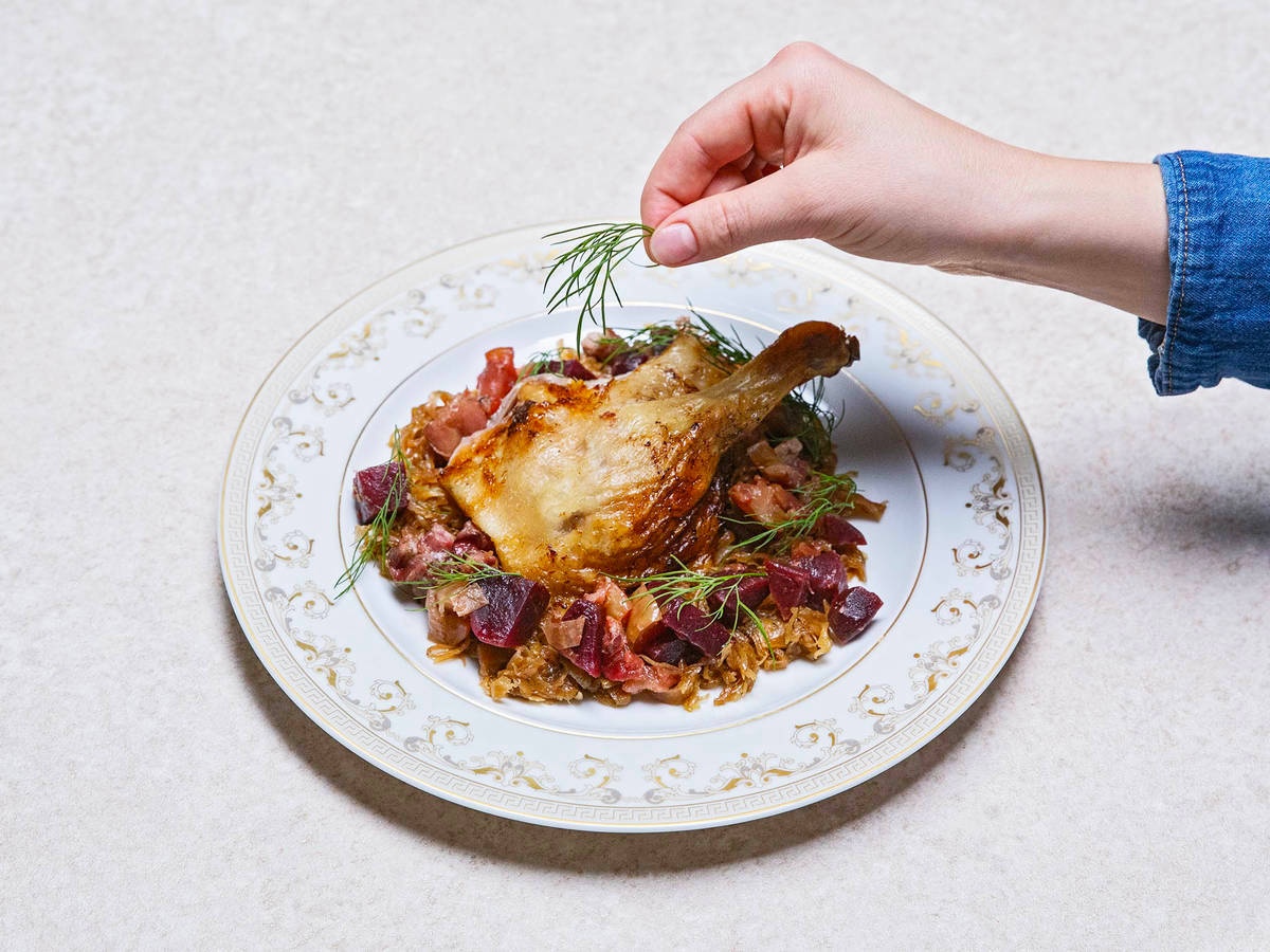 - Cắt vịt miếng vừa ăn. Thưởng thức với dưa cải Đức, hỗn hợp nhồi gồm củ dền, táo và thì là.