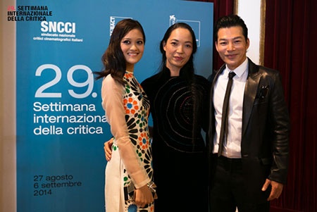 | Thùy Anh và đạo diễn Hoàng Điệp cùng mặc áo dài khi mang phim đi công chiếu tại LHP Venice. |