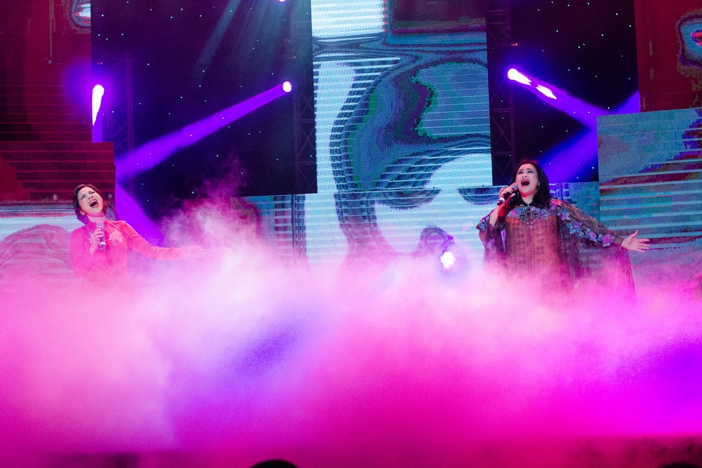 | Mỹ Linh và Thanh Lam song ca Bài ca không quên. Hai diva có sự phối hợp ăn ý trên sân khấu. Trong khi Thanh Lam da diết, cháy bỏng thì Mỹ Linh lại nhẹ nhàng, trữ tình. |