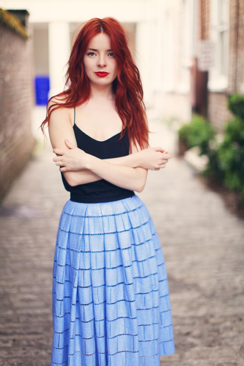 | Phong cách xuống phố cũng hết sức trẻ trung nhờ cách kết hợp áo 2 dây và váy xòe. |