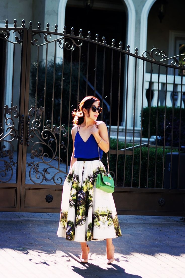 | Với set đồ áo 2 dây và váy midi họa tiết, bạn có một lựa chọn đẹp mắt cho thời trang tiệc tùng. |
