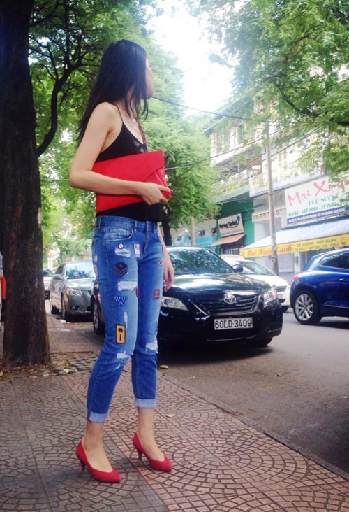| Thêm một cách tận dung áo 2 dây đen khi mix kèm quần jeans và phụ kiện đỏ trẻ trung của Thùy Dung. |