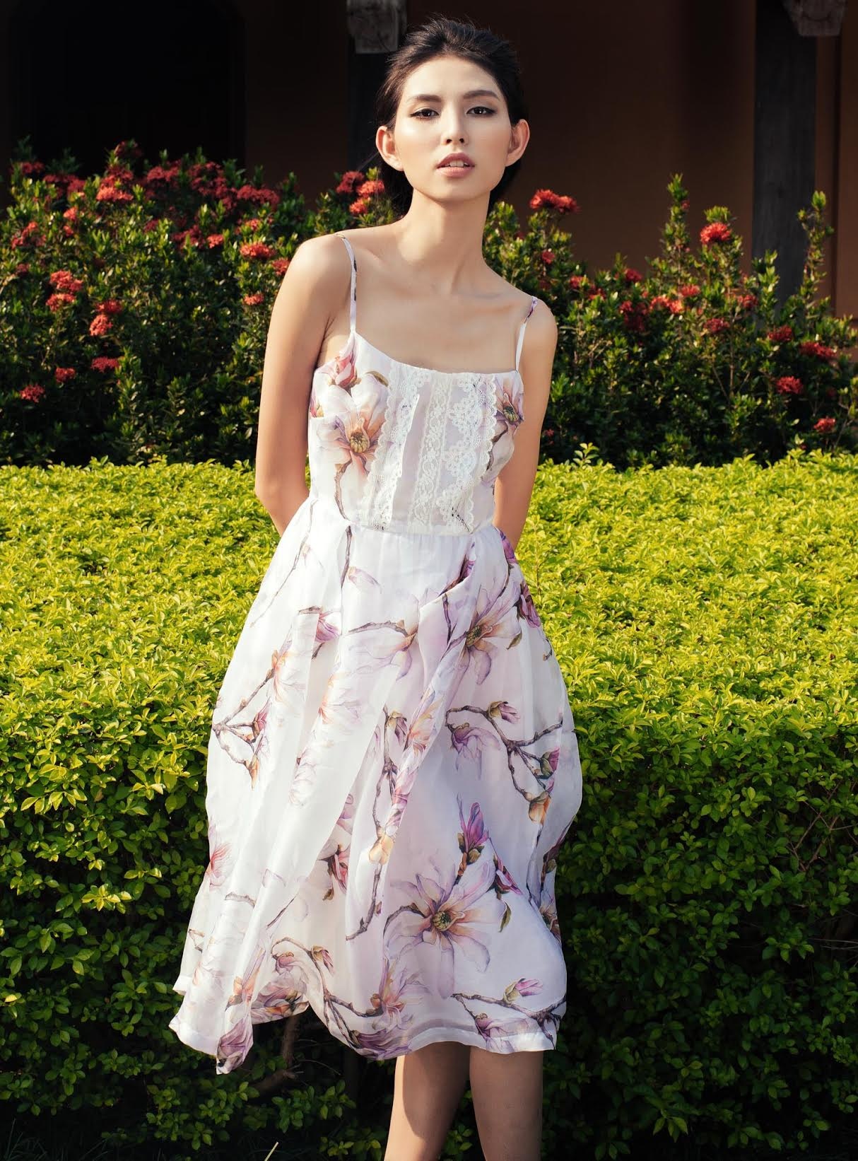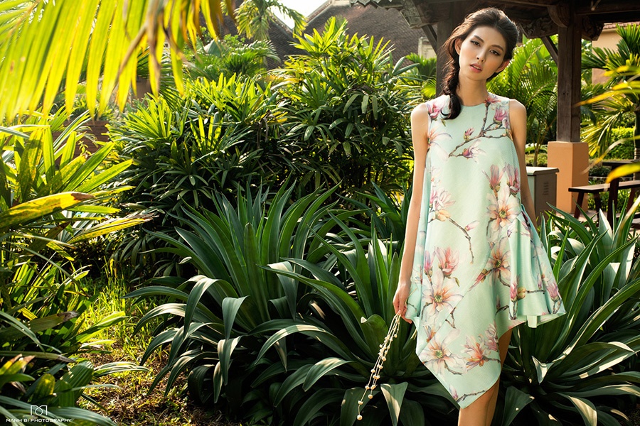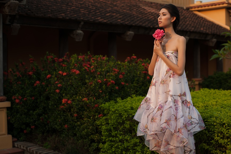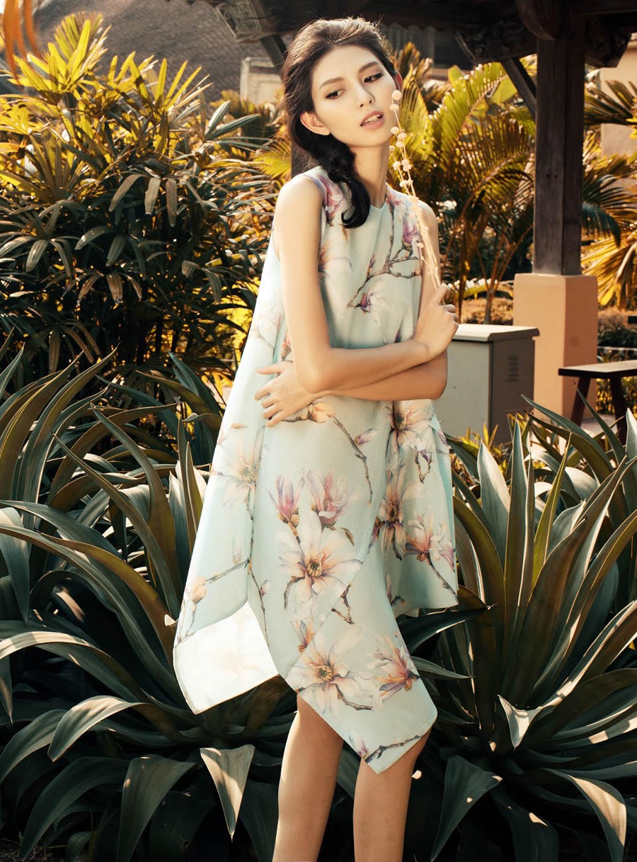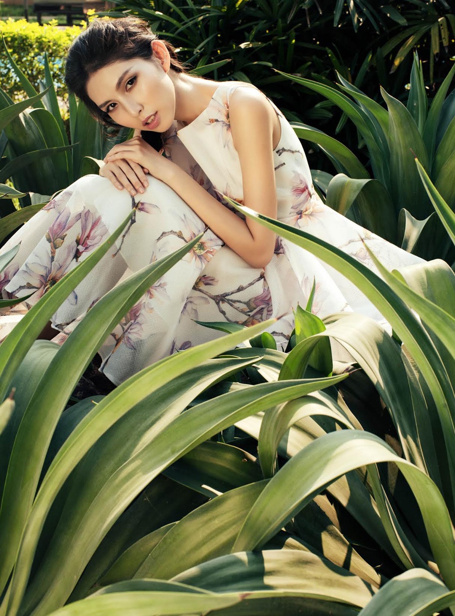 | Trang phục chất liệu mỏng nhẹ, họa tiết nữ tính tôn vóc dáng mảnh mai của Kate Moss phiên bản Việt. Bộ ảnh được thực hiện bởi stylist Travis Nguyễn, nhiếp ảnh Mạnh Bi, trang điểm Lilian Trần. |