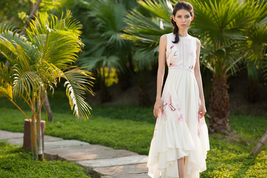 | Trong bộ ảnh, nhà thiết kế giới thiệu các mẫu váy mang đậm phong cách ứng dụng, pha trộn nét duyên dáng, nữ tính, lãng mạn đặc trưng của trang phục mùa hè. Trên nền chất liệu trắng, họa tiết hoa mộc lan gam hồng nhạt nổi bật một cách tinh tế, nhã nhặn. |