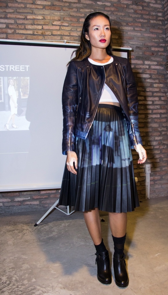 | Trong buổi hội thảo, Nhã Trúc được thử nghiệm phong cách chính của Black & White là punk style. Với phong cách này, cô được stylist mix cho bộ trang phục táo bạo nhưng không kém phần nữ tính là áo croptop đi cùng chân váy và áo khoác da+boots cá tính. |