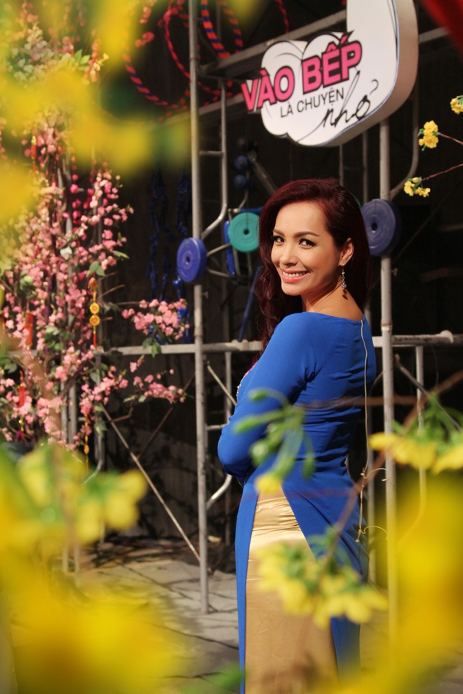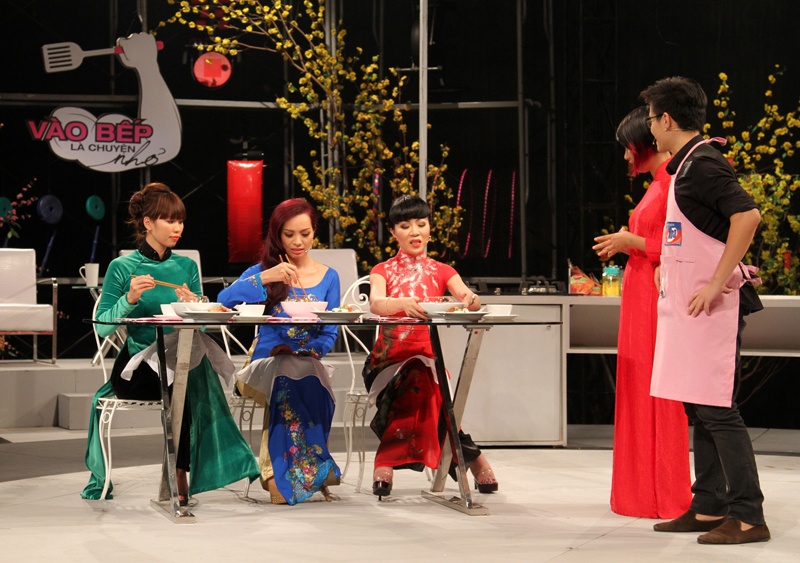 | Sân chơi Vào bếp là chuyện nhỏ đã khá quen thuộc với khá nhiều khán giả. Ở số đặc biệt đón xuân này, lần đầu tiên 3 vị giám khảo xinh đẹp cùng xuất hiện duyên dáng trong tà áo dài truyền thống. |