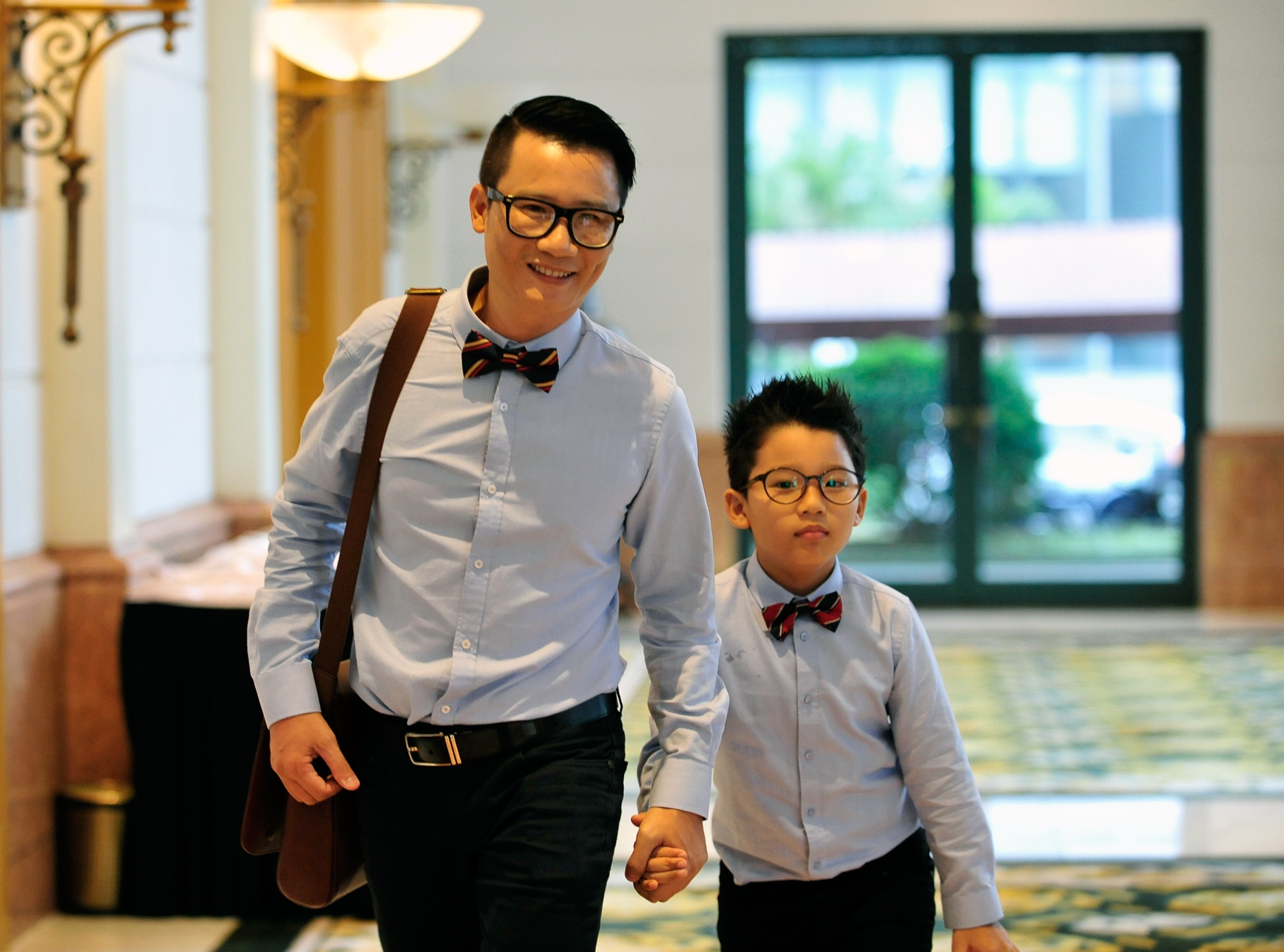 | Cặp bố con cuối cùng tham gia chương trình là ca sĩ Hoàng Bách và con trai Hoàng Minh, tên ở nhà là Tê Giác. Đây là cặp bố con bảnh bao nhất khi diện đồ ton-sur-ton rất ấn tượng. Bé Tê Giác điệu đà không kém bố khi vuốt tóc bảnh bao. |