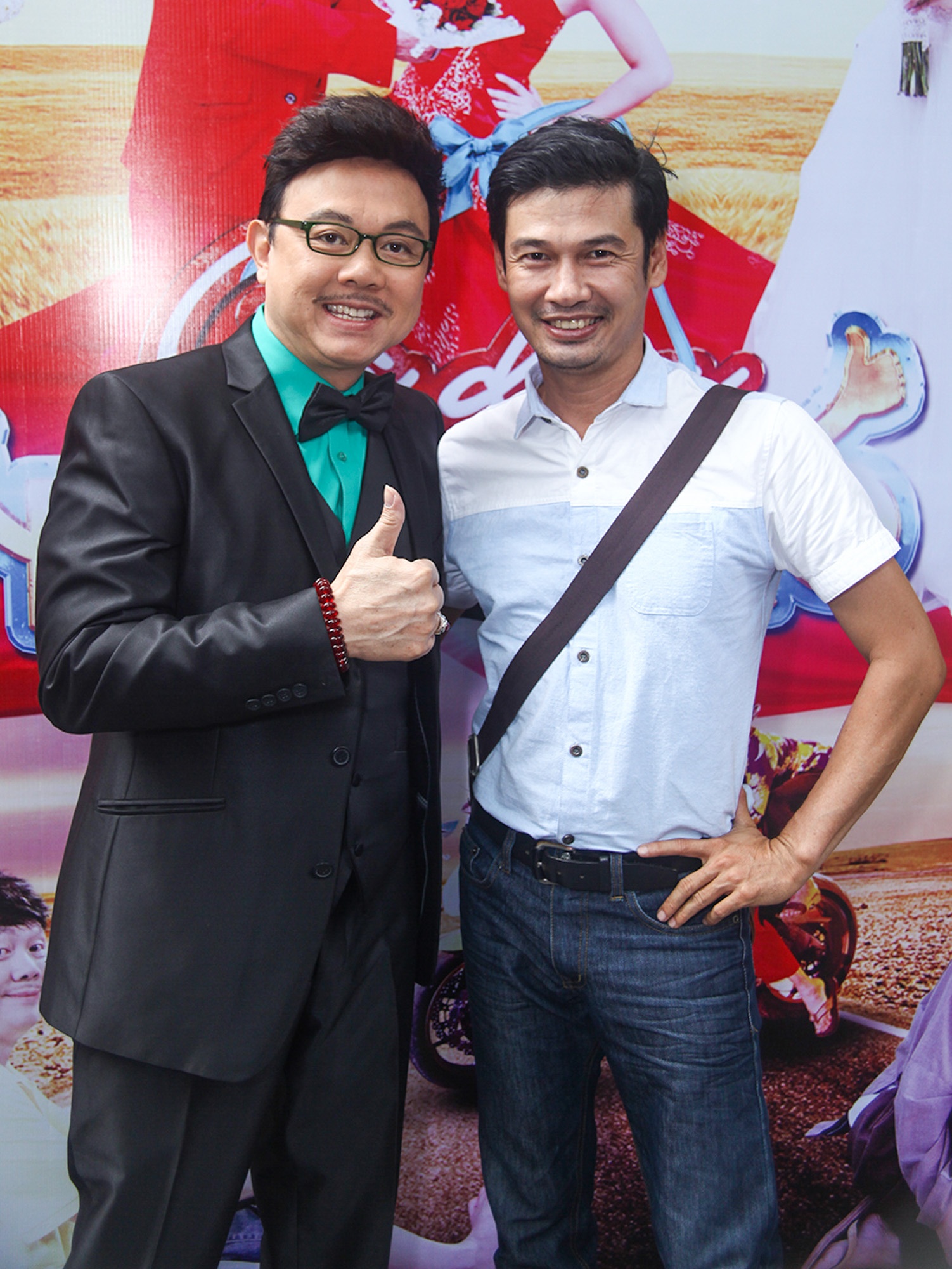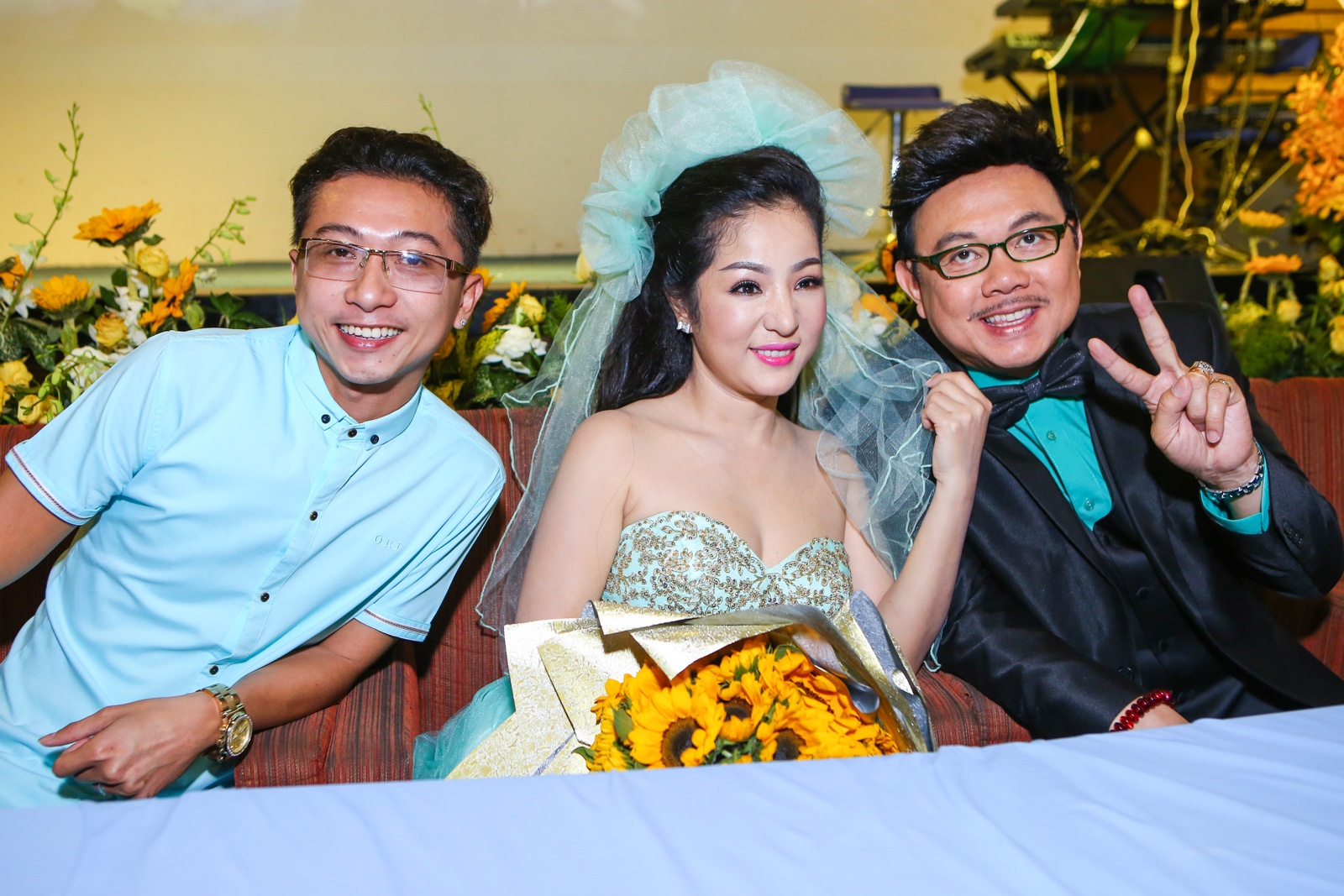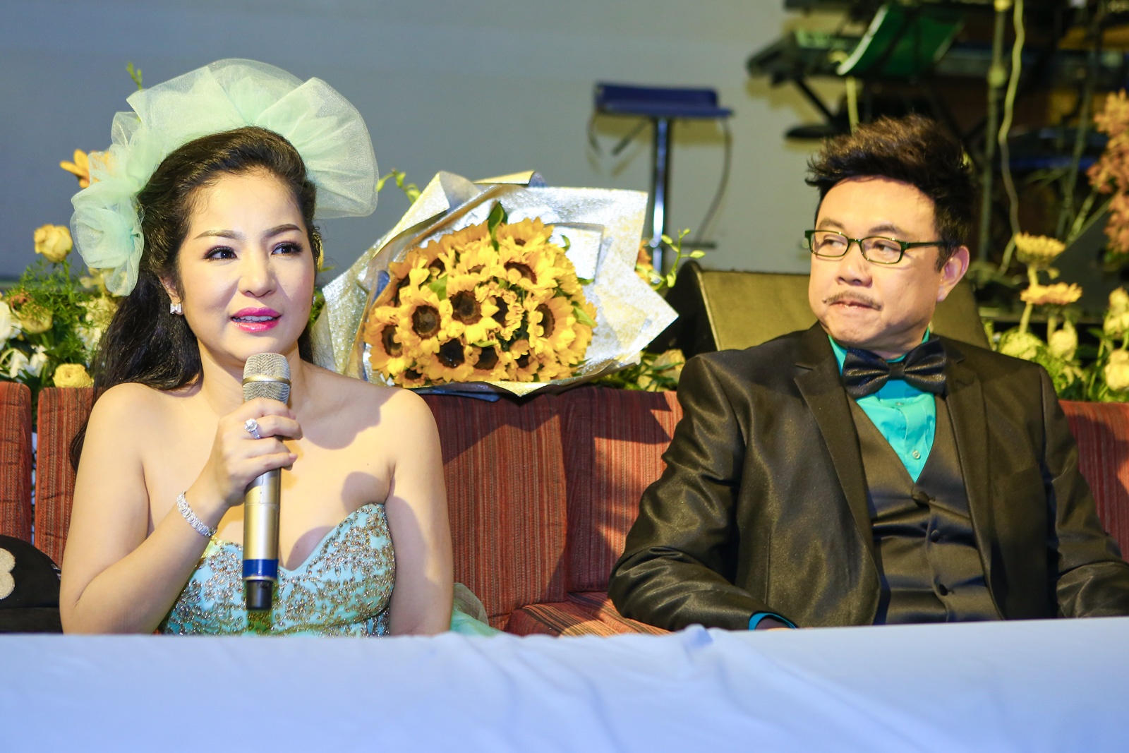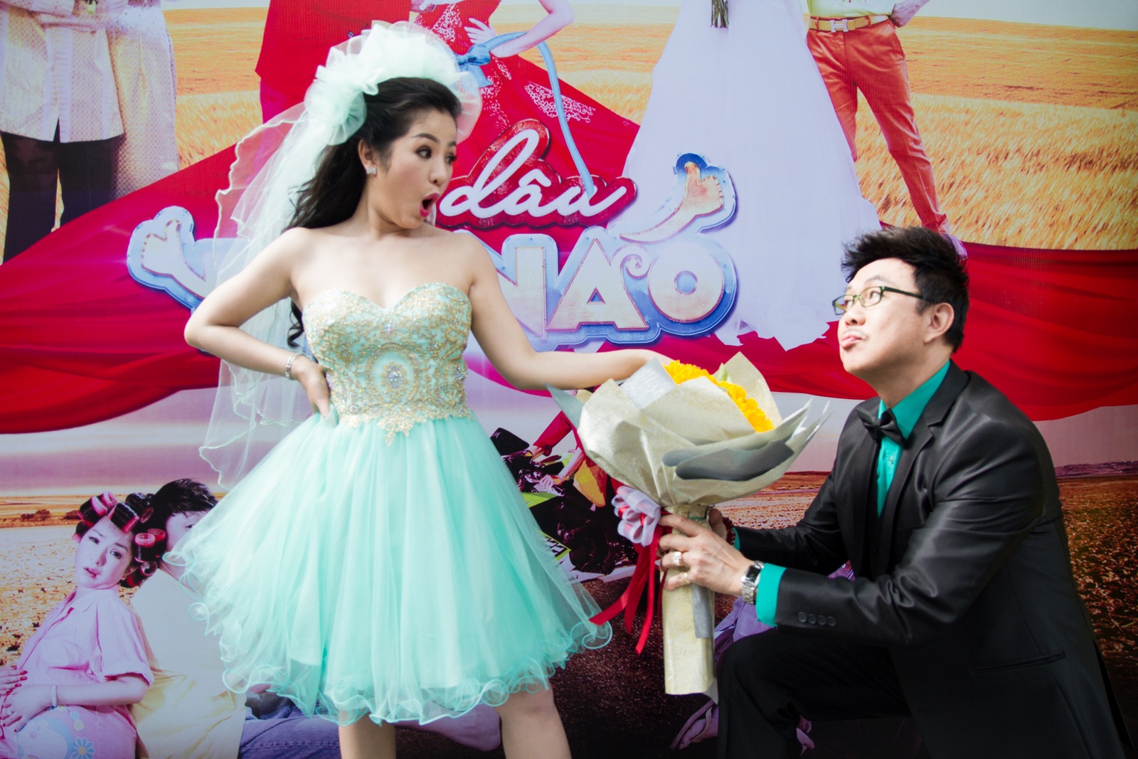 | Thúy Nga tiết lộ trước khi họp báo diễn ra, Chí Tài gọi điện thoại hỏi chị về màu sắc của trang phục. Cuối cùng, "hai vợ chồng" đồng điệu khi cùng chọn tông màu xanh lá. Nghe lời "dụ dỗ" của đồng nghiệp, anh không ngần ngại quỳ để cầu hôn bằng hoa. |