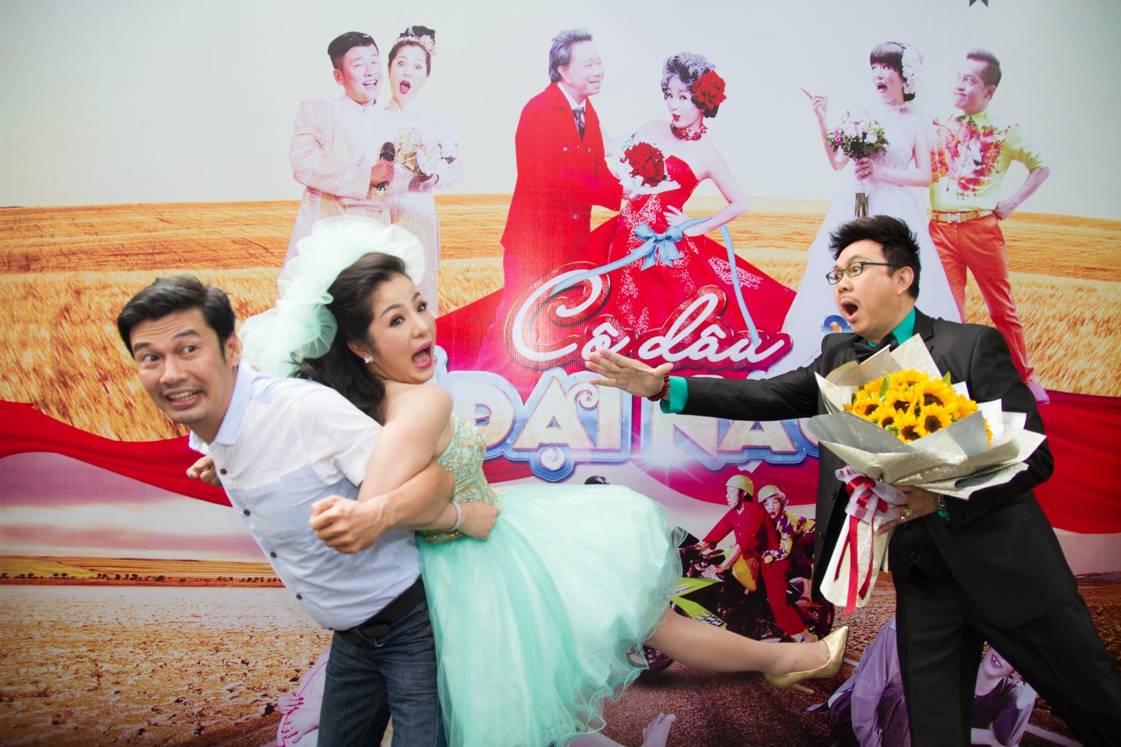 hóa thân thành các cô dâu với nhiều hoàn cảnh khác nhau. Đảm nhận vai các ông chồnglà các diễn viên hài Chí Tài, Tấn Beo, Minh Nhí, Bảo Chung, Hứa Minh Đạt. Còn nghệ sĩ Tiết Cương đến dự họp báo để chúc mừng người bạn thân từng học chung lớp tại trường Sân khấu TP HCM. |