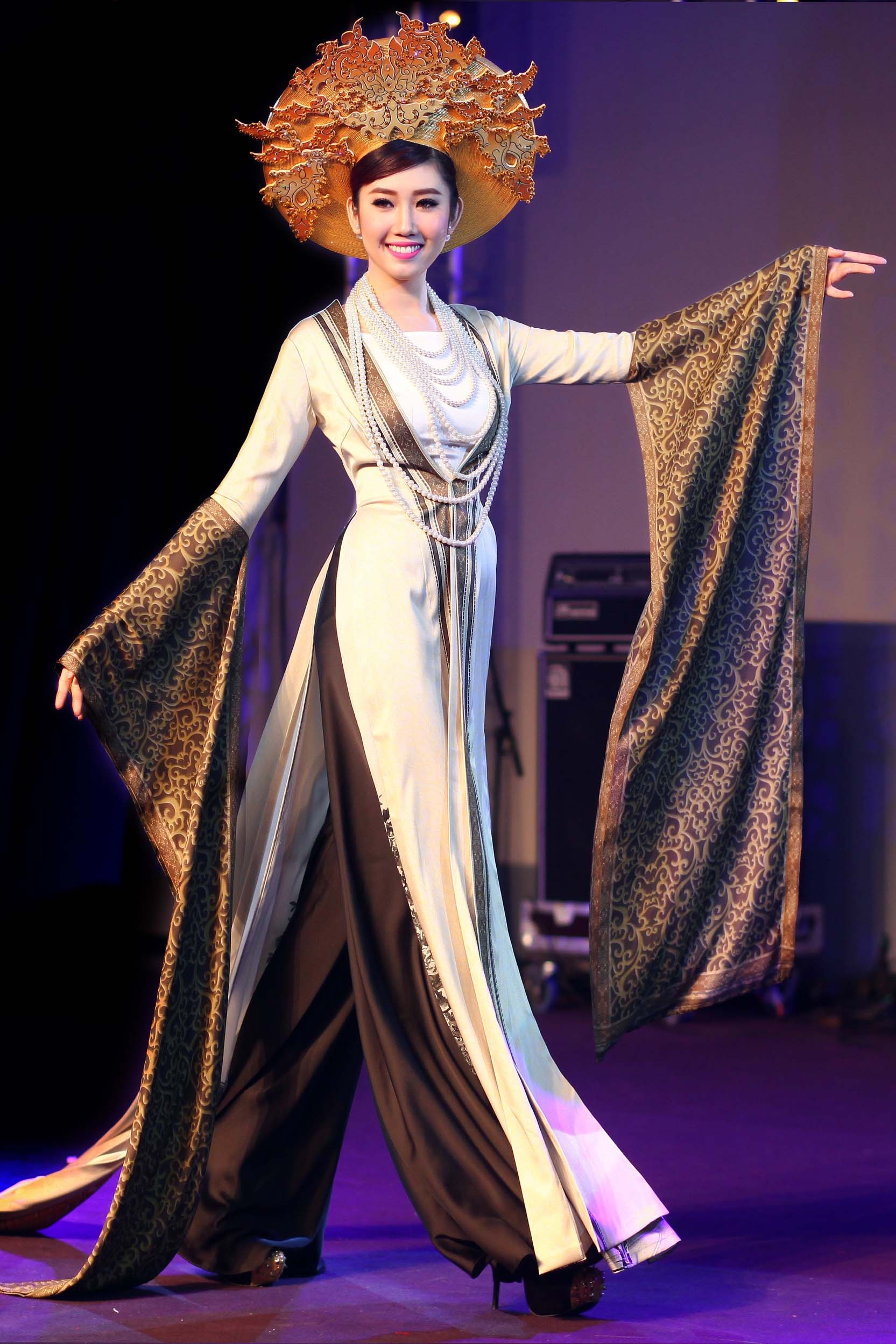 | Thiết kế được cách tân lược cổ áo, áo choàng bên ngoài có cánh tay dài mô phỏng từ trang phục vua chúa đất kinh thành ngày xưa. Trang phục mang đậm nét lịch sử đã thu hút sự quan tâm của khách mời tại sự kiện. Nhiều người dành lời khen cho thiết kế độc đáo, giúp họ hiểu hơn về truyền thống, văn hóa Việt. |
