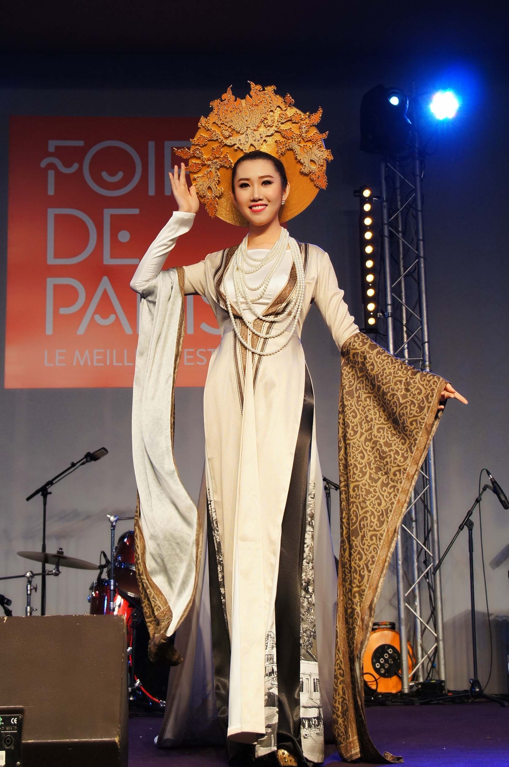 Thúy Ngân diễn áo dài cách tân của Ngô Nhật Huy ở Pháp