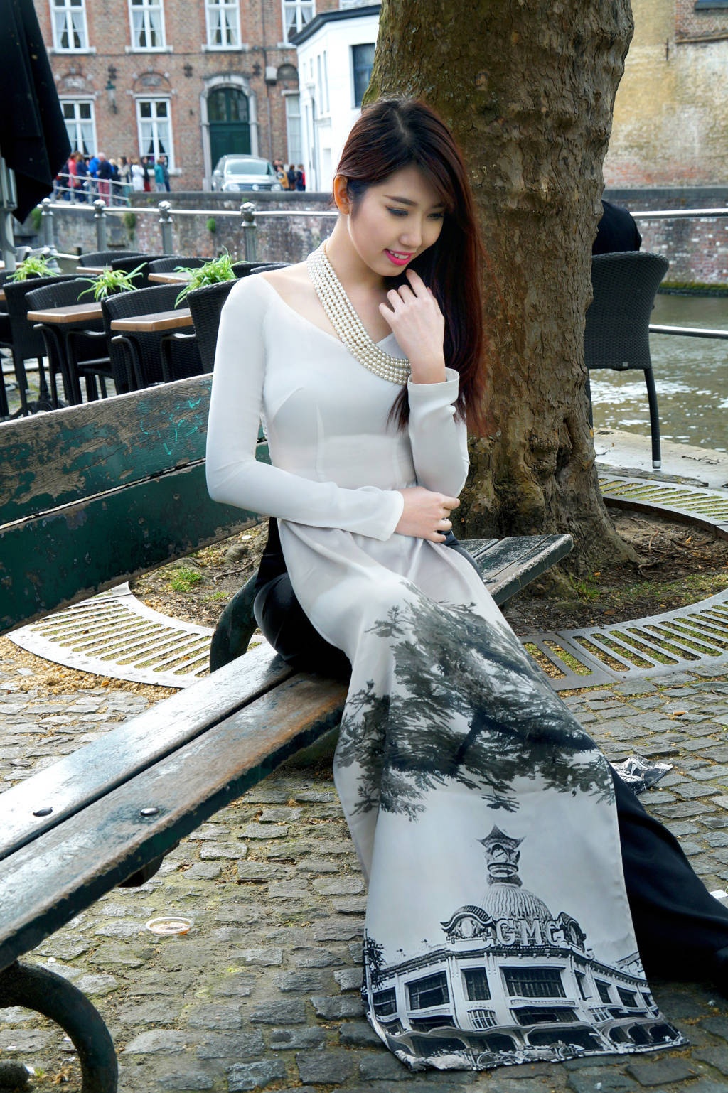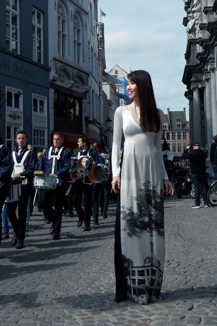 | Trong chuyến tham dự sự kiện giao lưu văn hoá quốc tế tại Paris (từ ngày 29/4 đến 29/5), Thuý Ngân dành thời gian thực hiện bộ ảnh mới, giới thiệu thiết kế áo dài mang đậm hồn Việt do NTK Ngô Nhật Huy sáng tạo. Bộ ảnh được chụp tại những địa danh nổi tiếng ở thành phố Bruges (Bỉ). |