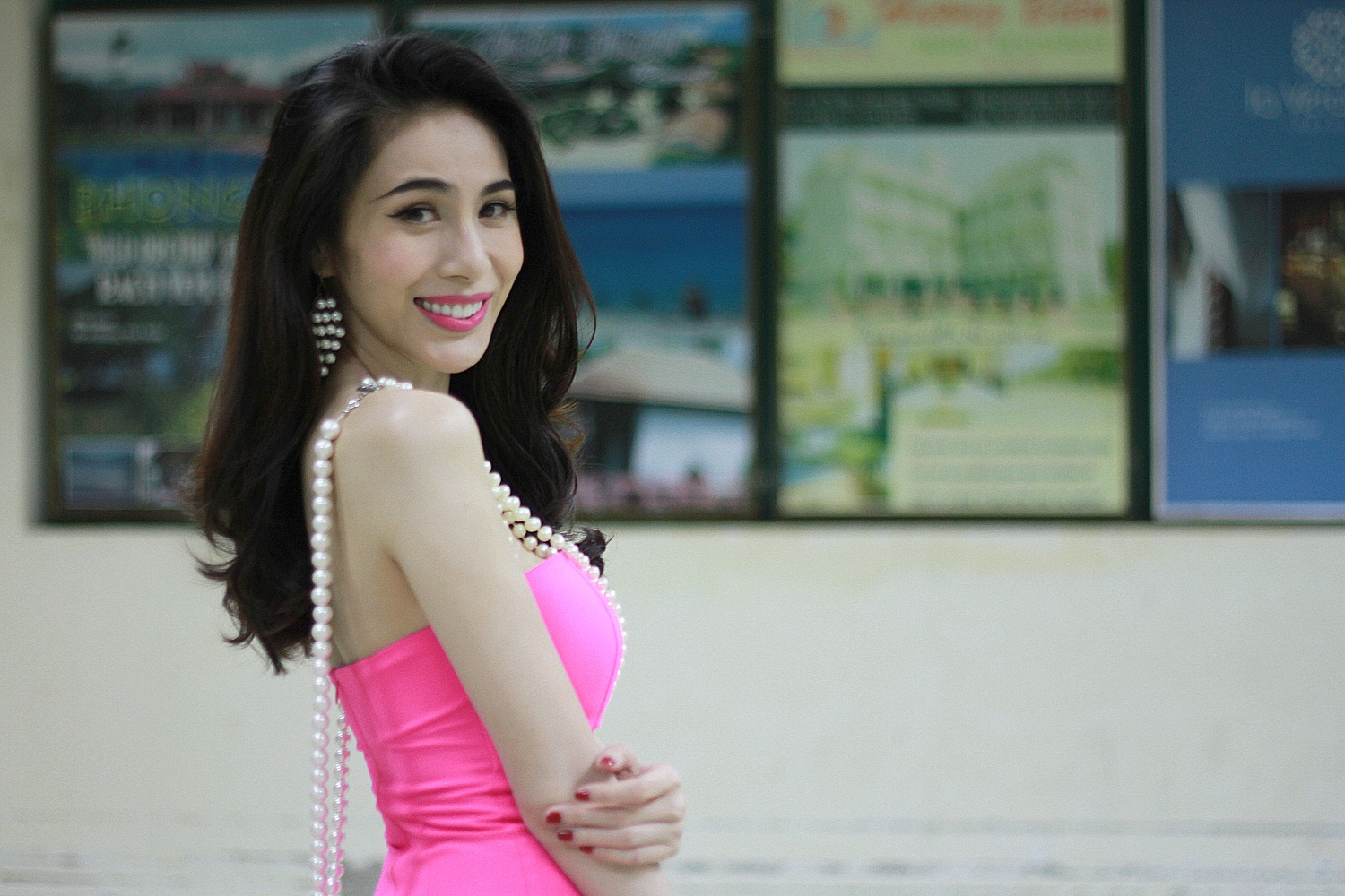 | Ngoài ra, cô còn thể hiện gu thẩm mỹ cao khi kết hợp trang phục với các phụ kiện dây đeo cổ, hoa tai ngọc trai vô cùng sang trọng. |
