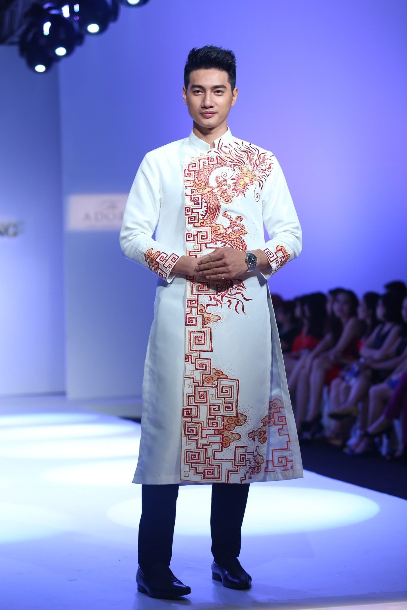 Ngoài ra, nhà thiết kế Minh Châu còn bật mí về áo dài nam dành cho chú rể Công Vinh. Thiết kế có gam màu trắng chủ đạo, được in họa tiết rồng uy nghiêm, đậm chất truyền thống và tiệp màu cùng trang phục cô dâu. Mẫu áo dài nằm trong bộ sưu tập Sắc màu tình yêu mà anh vừa giới thiệu cho mùa cưới năm nay.