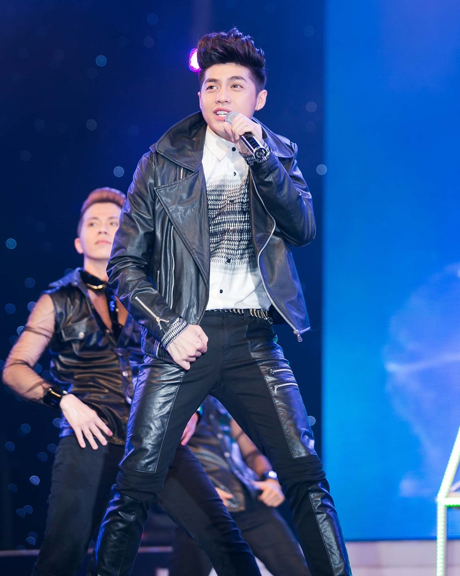 Noo Phước Thịnh diện trang phục chất da nam tính. Anh vẫn giữ vững phong độ trên sân khấu khi biểu diễn bài hát mới ra mắt - Chôn giấu giấc mơ.