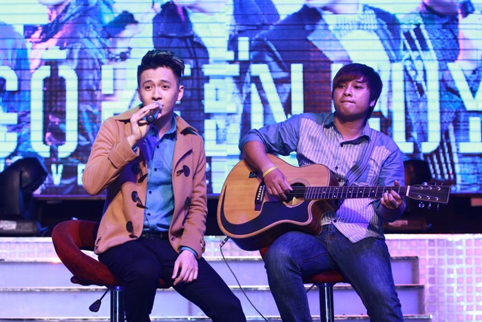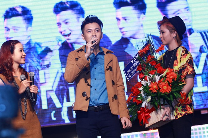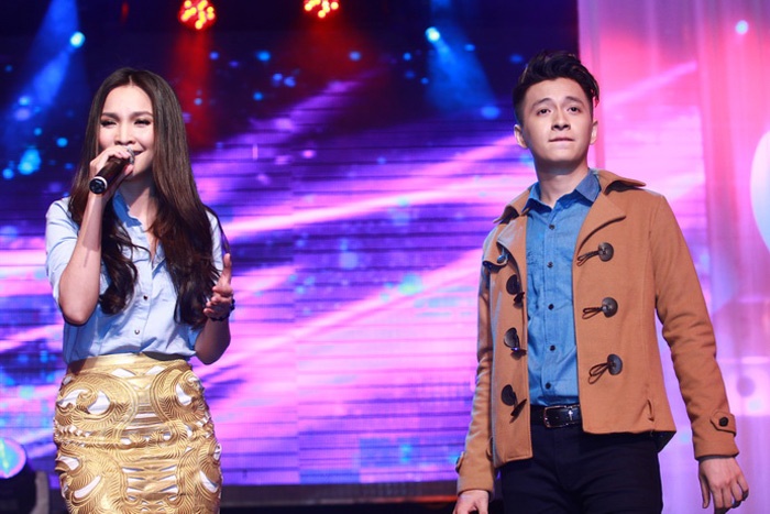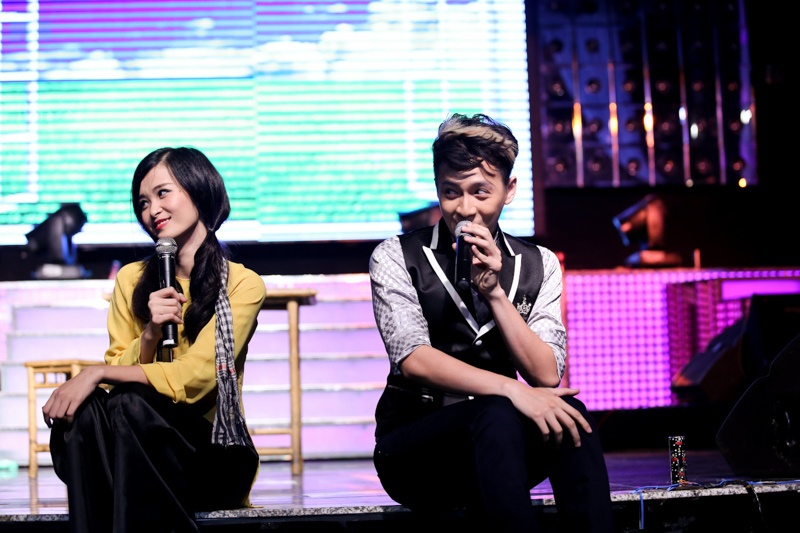 Trong khi bà xã của Công Vinh mặc trẻ trung, gợi cảm thì Đông Nhi lại mộc mạc với áo bà ba khi song ca cùng Ngô Kiến Huy trong đêm nhạc riêng.