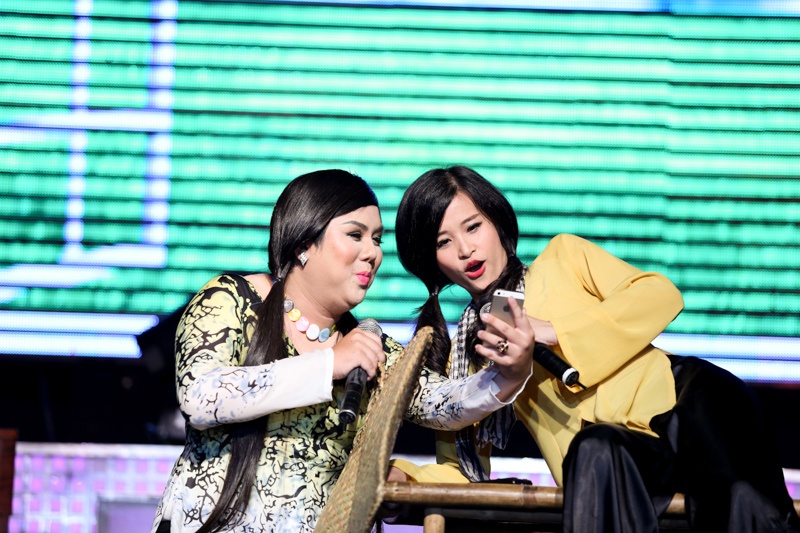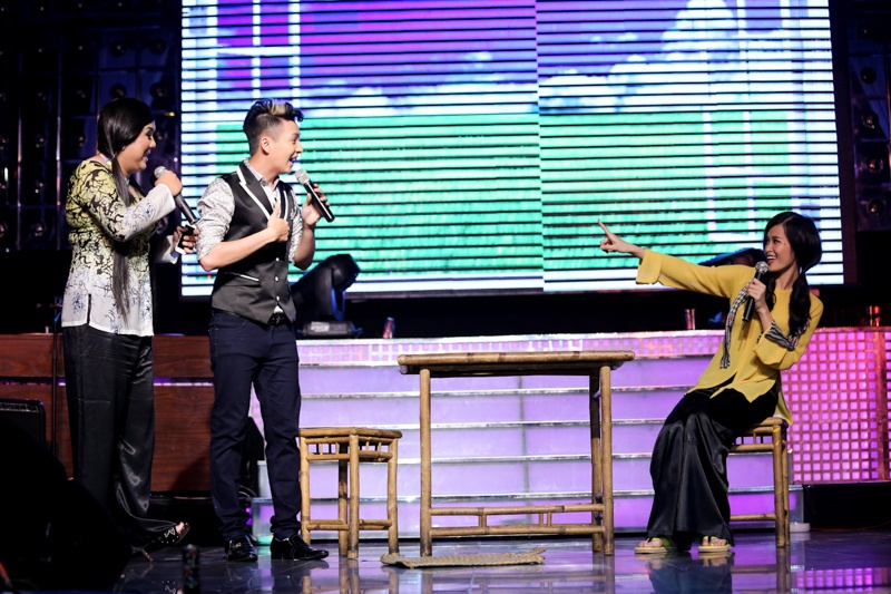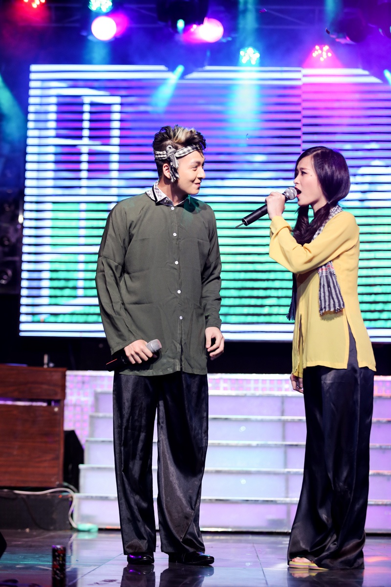 | Không chỉ trổ tài hát dân ca, Ngô Kiến Huy và cô bạn thân Đông Nhi còn tung hứng diễn kịch khiến khán giả cười ngất. |