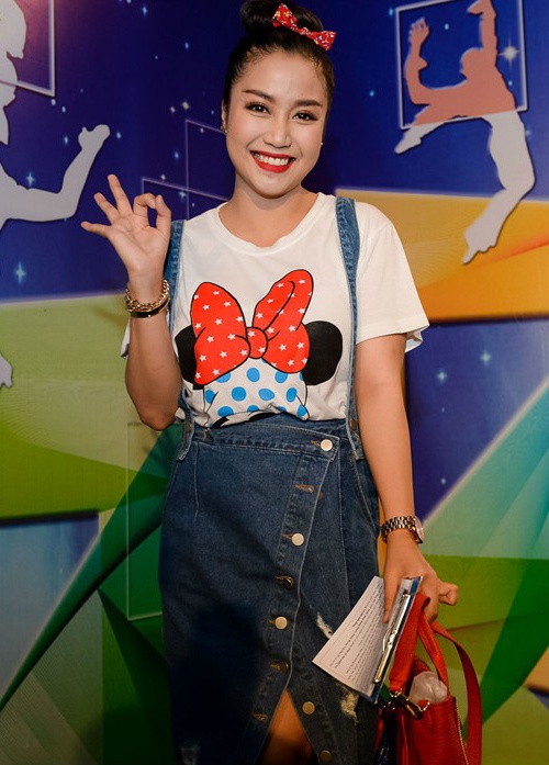 | Góp mặt trong list sao mặc xấu tuần qua có Ốc Thanh Vân. Bà mẹ ba con làm mới phong cách với áo thun in hình chuột Mickey và chân váy denim cài cúc trước khi dẫn chương trình Bước nhảy hoàn vũ nhí. Bộ cánh bị nhận xét không phù hợp độ tuổi 31 của người mặc. |