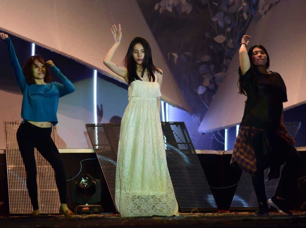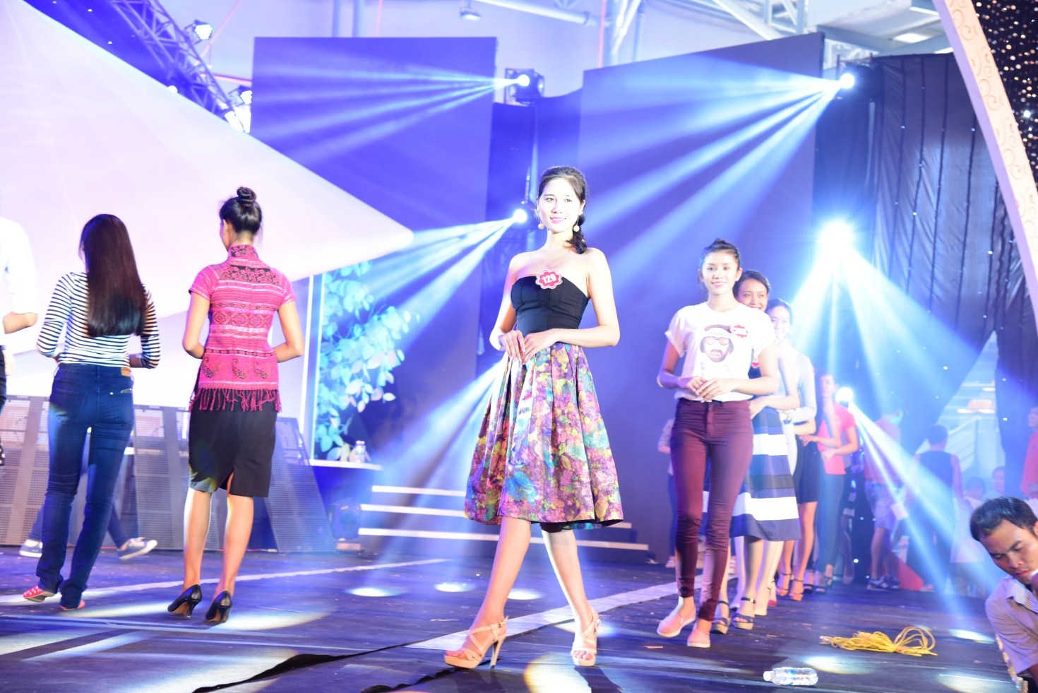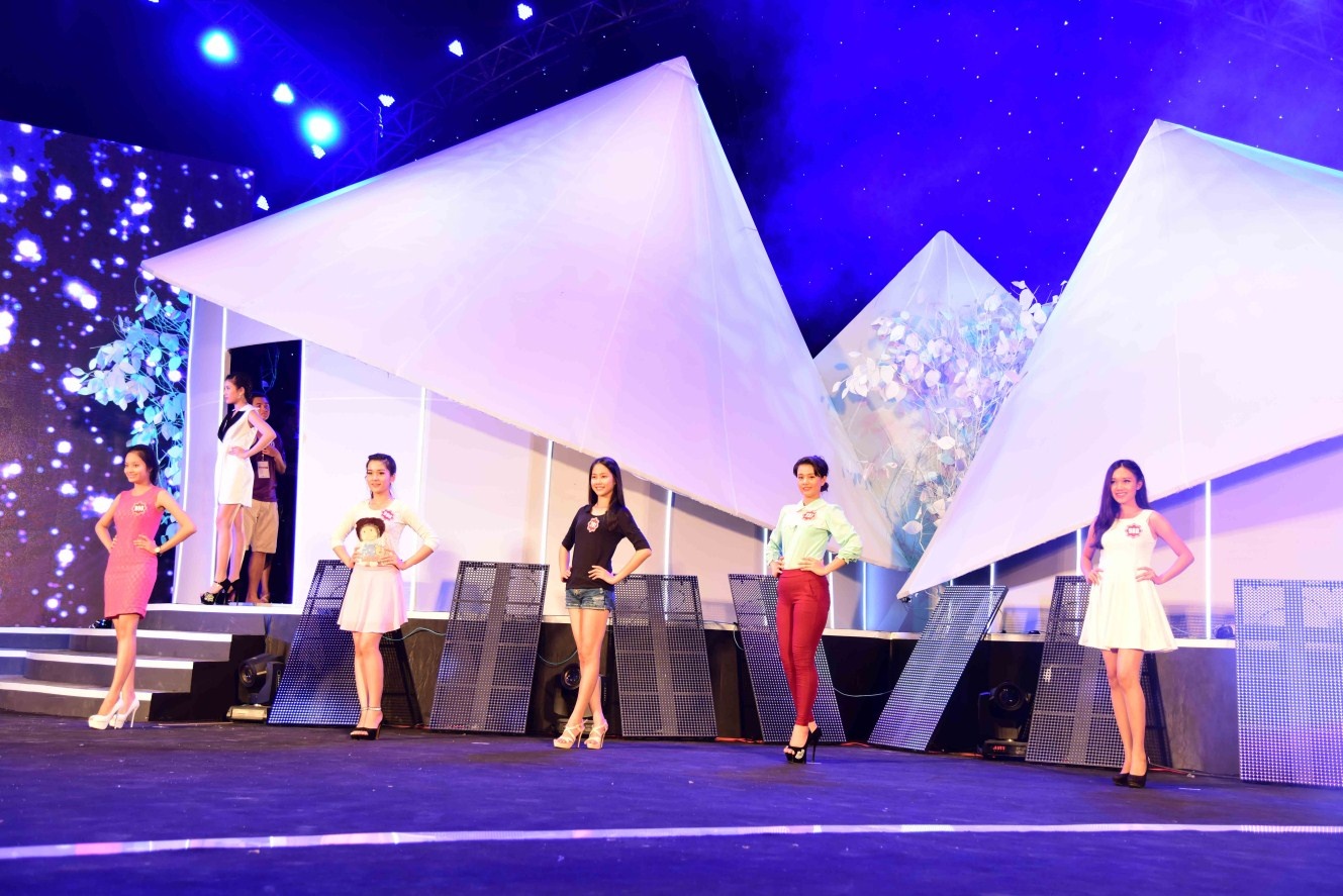 | Các người đẹp tập sải bước dưới ánh đèn sân khấu. |