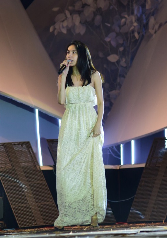 | Nữ ca sĩ Kiss me trông đơn giản, dễ gần trong bộ váy ren, gương mặt không trang điểm. |