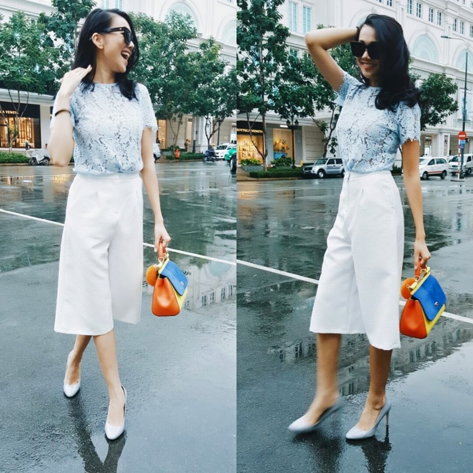 | Thanh Hằng duyên dáng trên đường phố sau cơn mưa với bộ cánh áo ren xuyên thấu kèm quần lửng sáng màu. Phụ kiện túi màu sắc phối hợp tông làm điểm nhấn. |