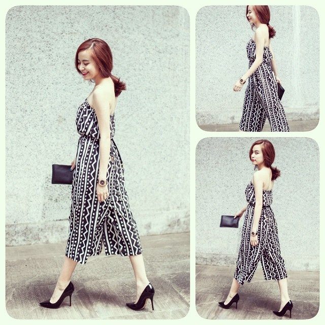 Hoàng Thùy Linh trở thành điểm nhấn phong cách của tuần nhờ bộ cánh họa tiết zic zac sành điệu. Kiểu mốt jumpsuit dáng quây giúp người đẹp khoe vai trần gợi cảm.