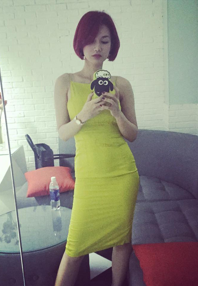 | Bà mẹ một con Quỳnh Chi khoe vóc dáng cân đối trong bộ đầm thun bó sát gam màu vàng rực rỡ. Cô đổi kiểu tóc bob ngắn cá tính. |