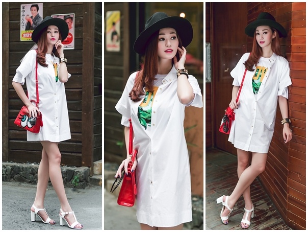 | Diễn viên - người mẫu Khánh My diện sơ-mi trắng "giấu quần" để bắt nhịp xu hướng hot. Người đẹp Mỹ nhân Sài thành khéo léo chọn phụ kiện tiệp sắc màu. |